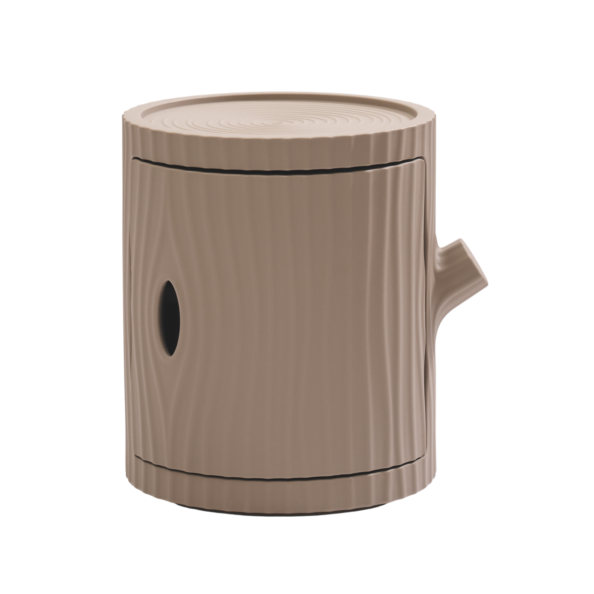 Tronco ist ein multifunktionaler Behälter, inspiriert von der Form eines Baumstamms. Hergestellt aus langlebigem, vollständig recycelbarem Polyethylen, vereint er die Funktion eines praktischen Aufbewahrungsorts mit einem originellen, dekorativen Design. Sie können darin die notwendigsten Gegenstände aufbewahren oder ihn als Beistelltisch nutzen, indem Sie Dinge auf seiner Oberfläche abstellen.