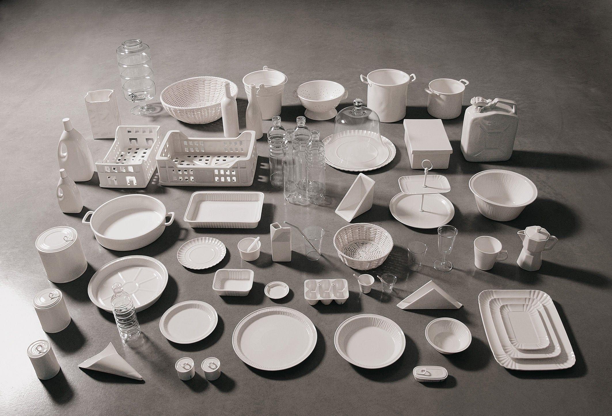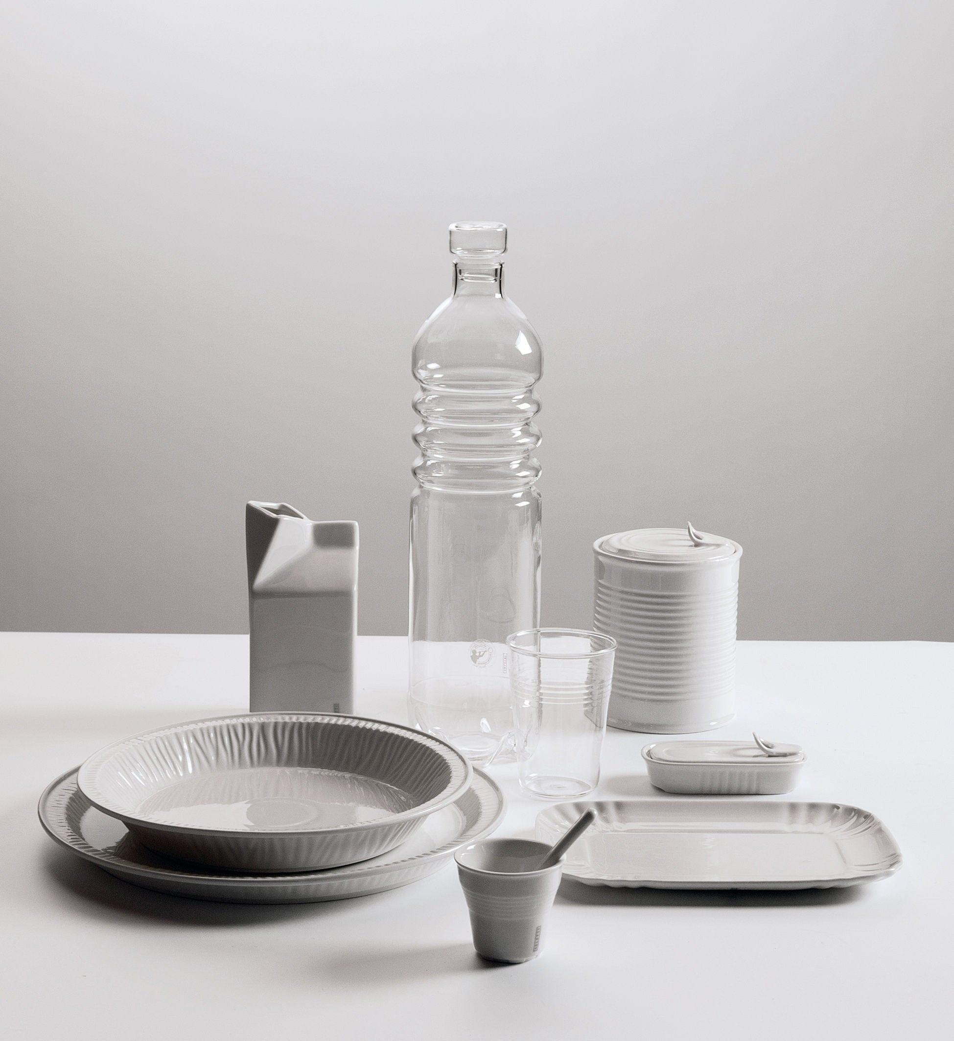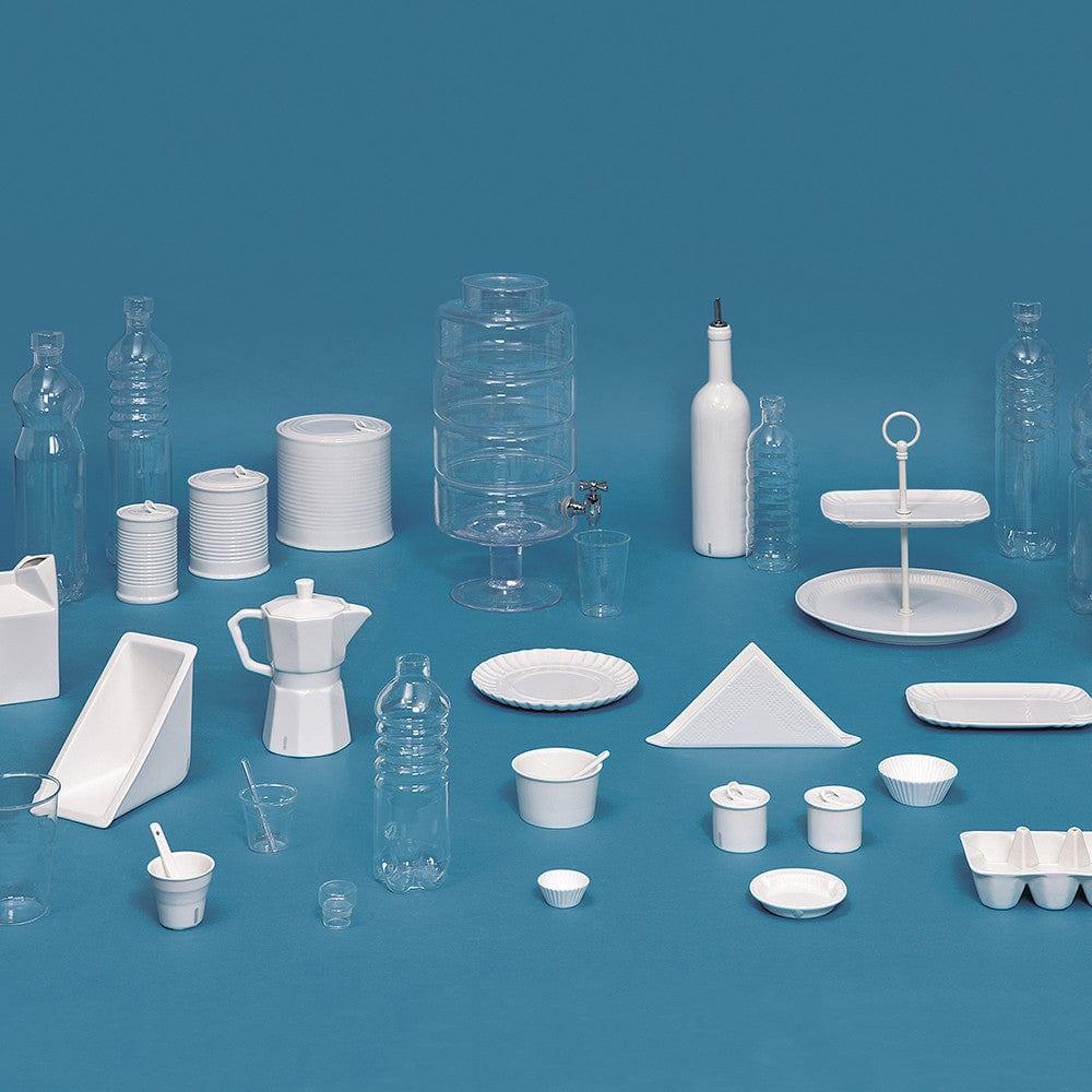 Linie von Geschirr aus Borosilikatglas, die Seletti weltweit eingeführt hat. Die Formen sind einfach, schlicht und inspiriert von Einwegprodukten. Das Darstellen unerwarteter, alltäglicher Gegenstände wird zum Design.