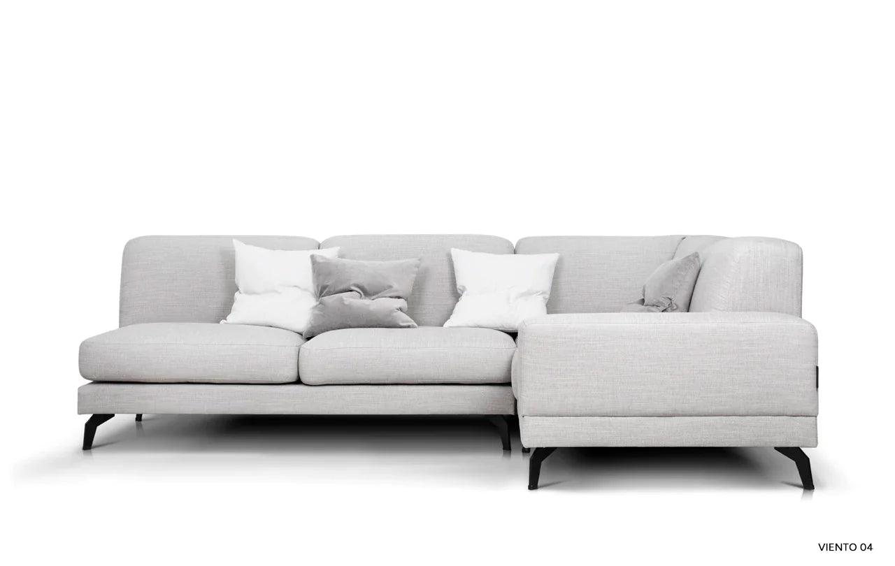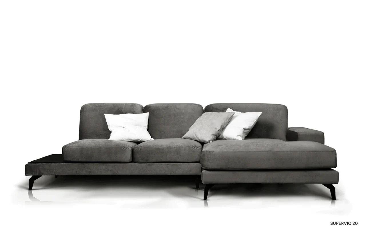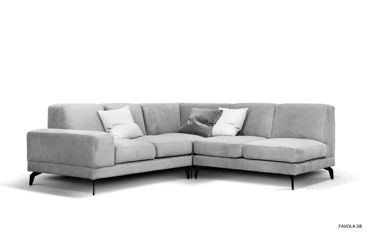 Rechtsseitige Eckcouch Enjoy, dank der Füllung aus hochflexiblem Polyurethanschaum, bietet außergewöhnlichen Komfort und Freude bei der Nutzung. Die charakteristischen, gebogenen, metallischen Beine verleihen ihr sowohl Charakter als auch Leichtigkeit. Der Kunde hat die Möglichkeit, die Einstellungen der einzelnen Elemente der Eckcouch anzupassen, um seinen individuellen Erwartungen gerecht zu werden.