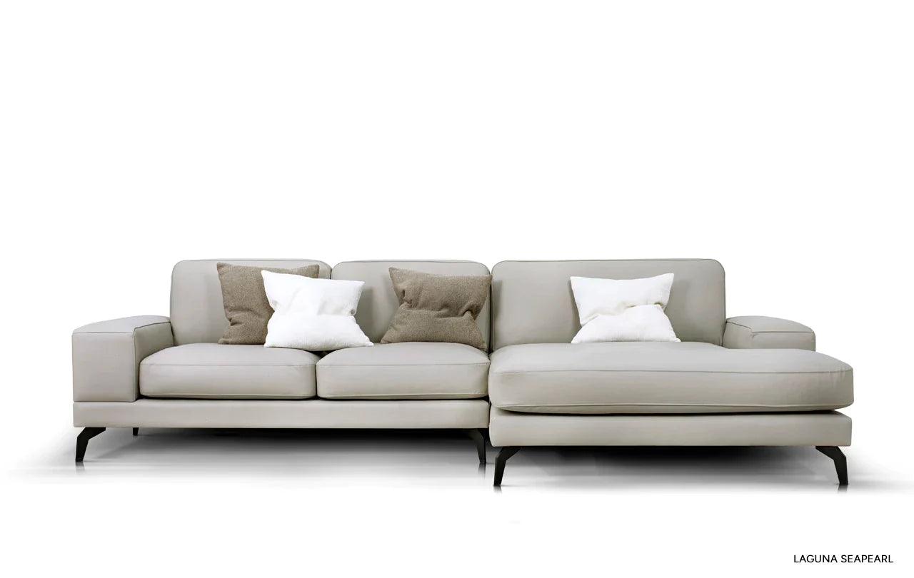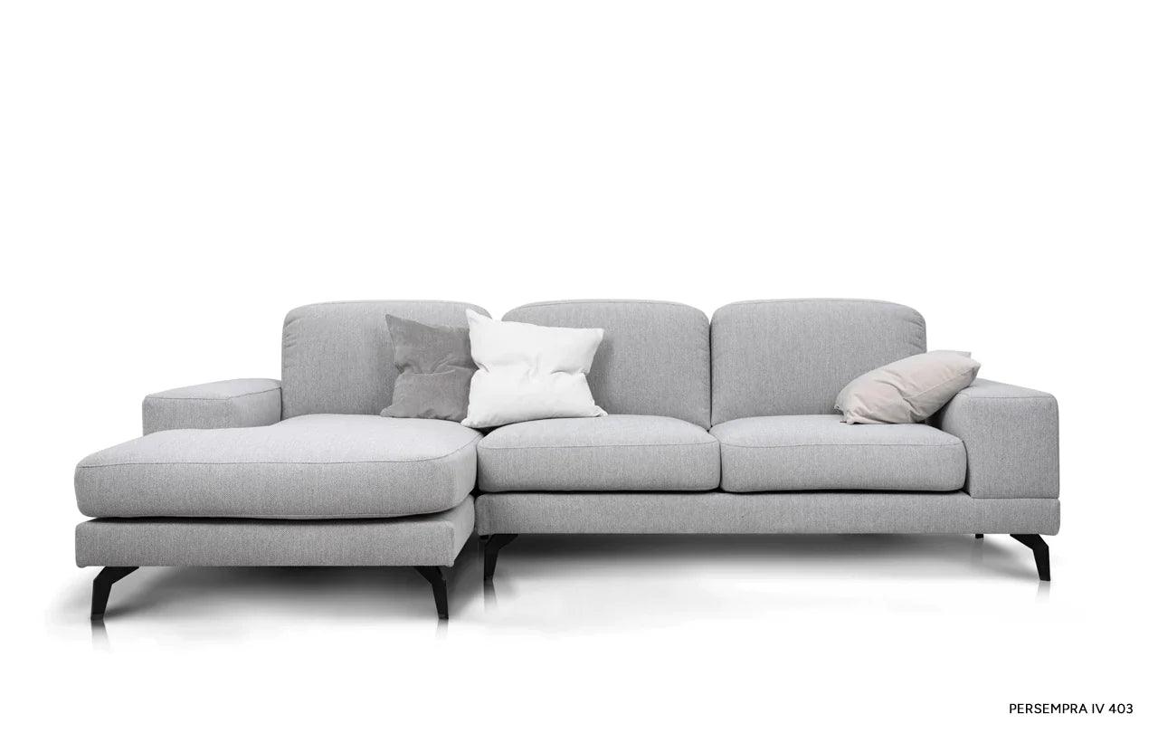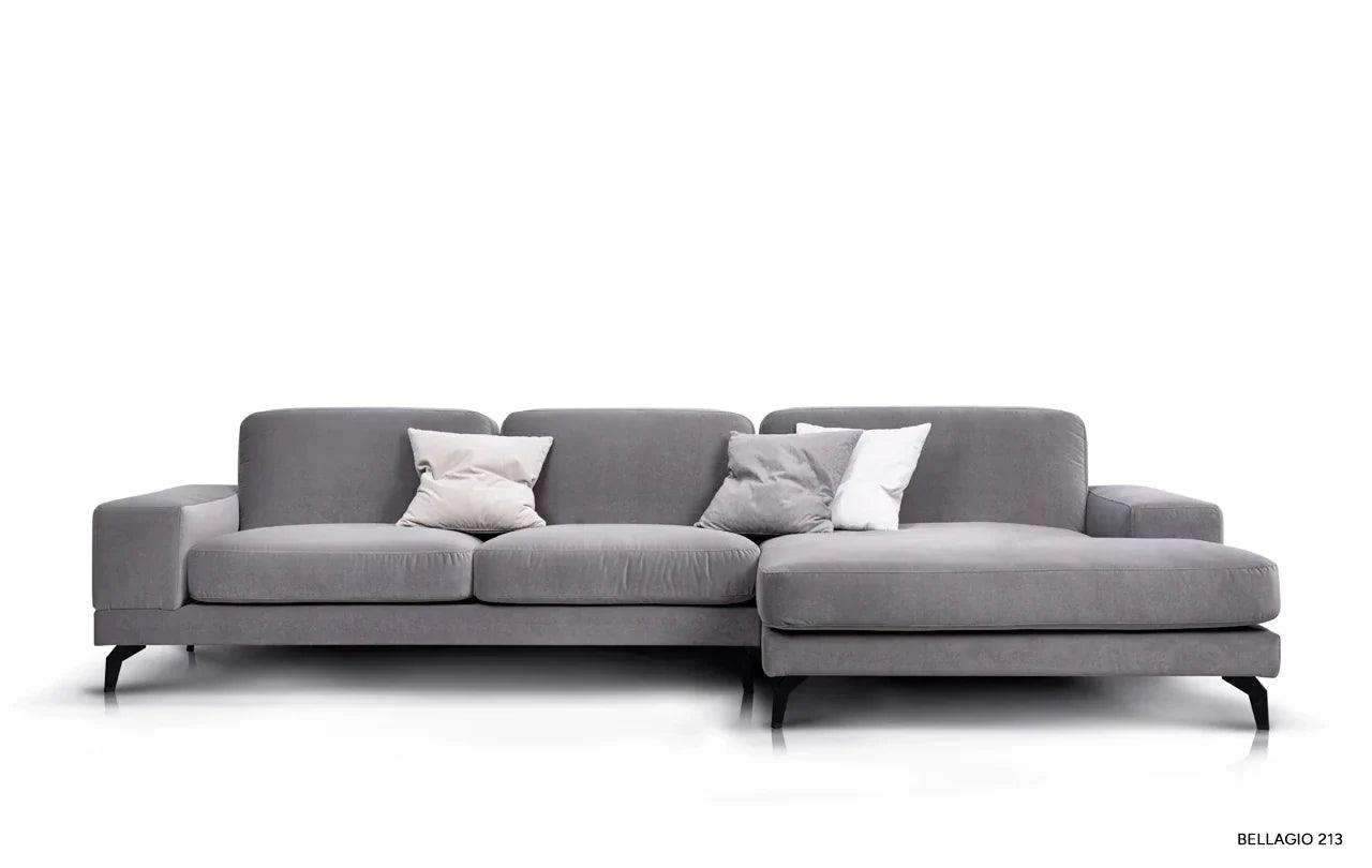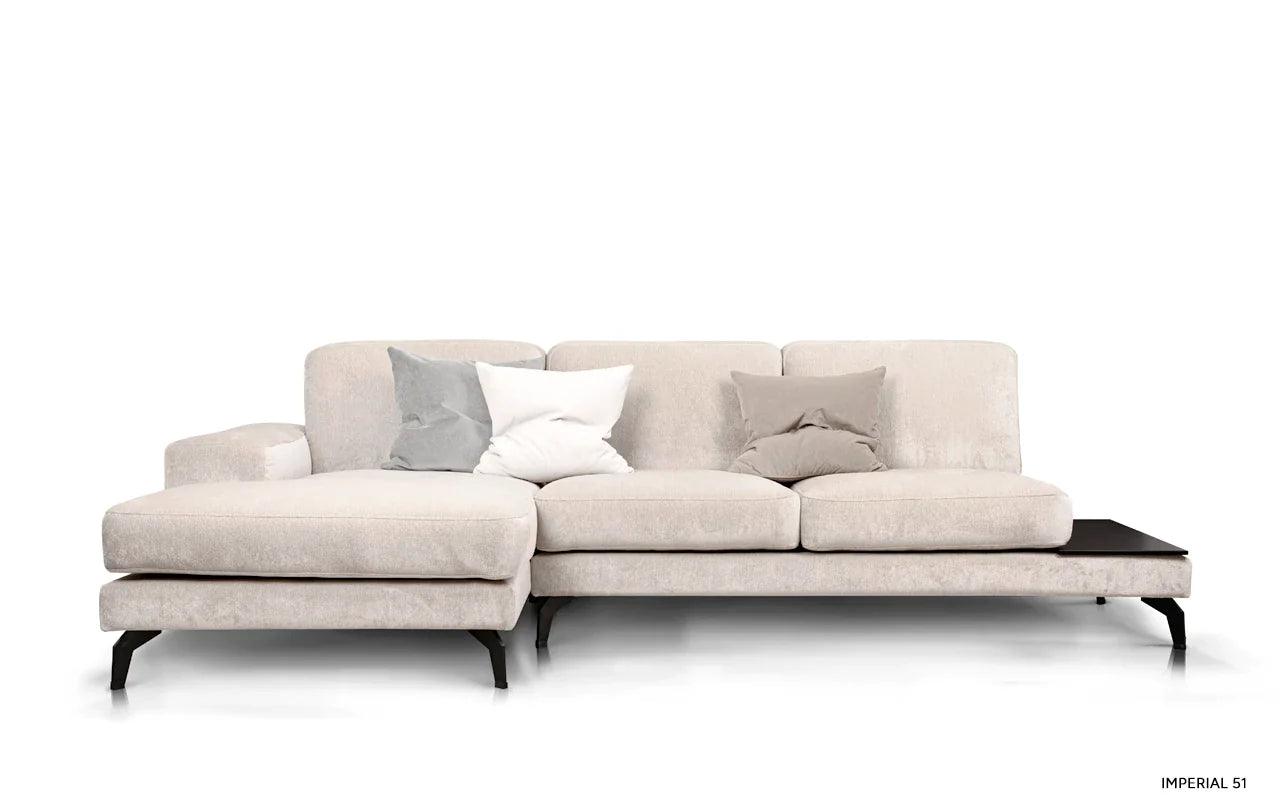 Rechtsseitige Eckcouch Enjoy, dank der Füllung aus hochflexiblem Polyurethanschaum, bietet außergewöhnlichen Komfort und Freude bei der Nutzung. Die charakteristischen, gebogenen, metallischen Beine verleihen ihr sowohl Charakter als auch Leichtigkeit. Der Kunde hat die Möglichkeit, die Einstellungen der einzelnen Elemente der Eckcouch anzupassen, um seinen individuellen Erwartungen gerecht zu werden.
