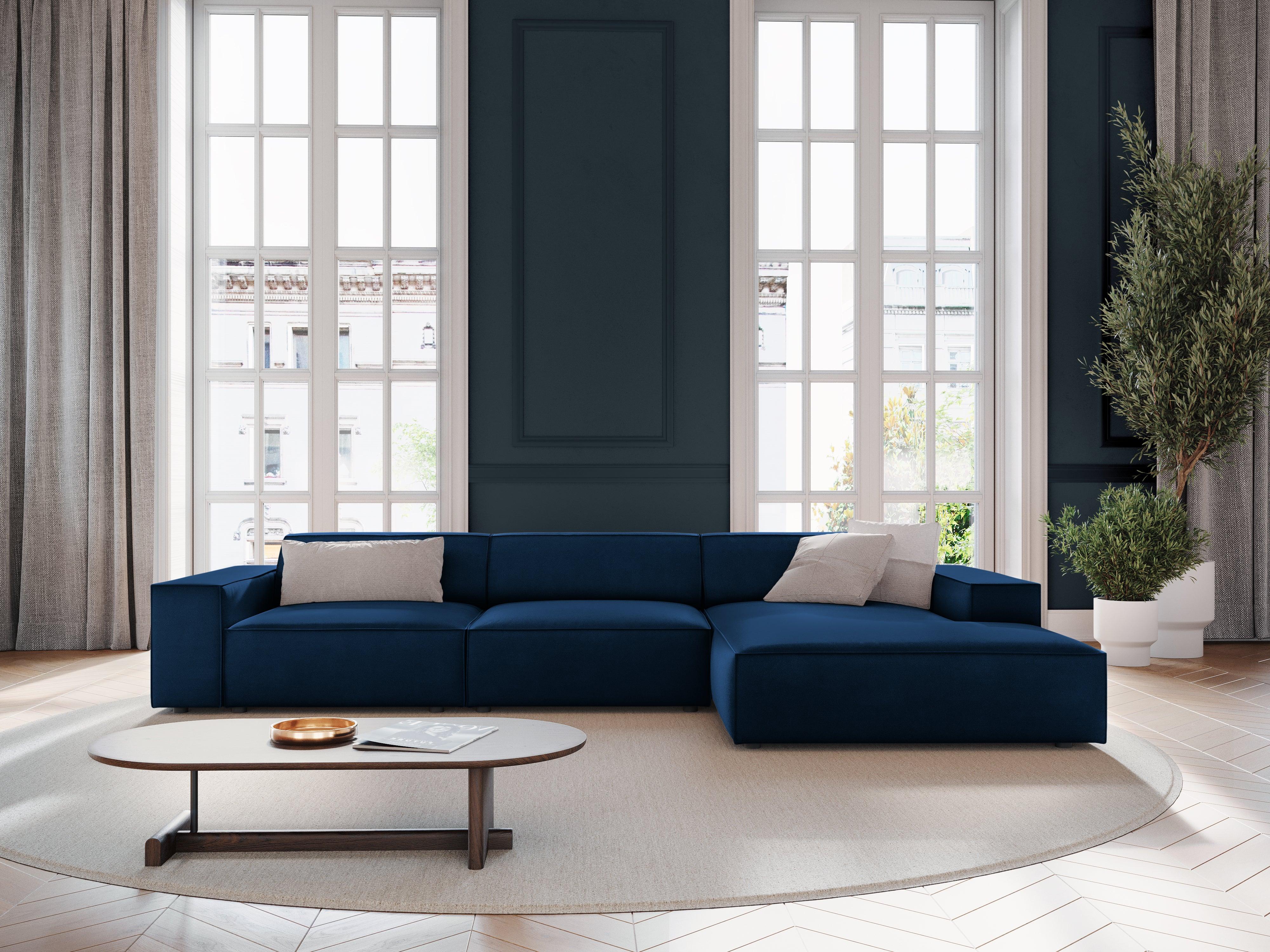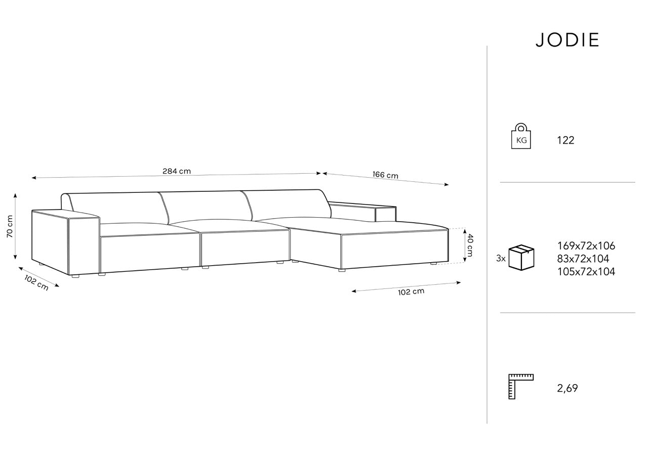 Die Sitzfläche des Sofas besteht aus samtigem Stoff, der nicht nur Komfort, sondern auch Langlebigkeit und Widerstandsfähigkeit gegen Beschädigungen garantiert. Das Jodie-Sofa ist zudem sehr praktisch - es kann je nach Bedarf mit einer linken oder rechten Seite bestellt werden.