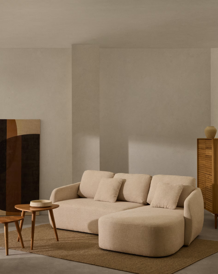 Die Füllung aus Schaumstoff mit einer mittleren Dichte von 28 kg/m³ sowie die Rückenkissen mit abnehmbaren Bezügen garantieren ausgewogene Weichheit und optimalen Halt. Die Konstruktion aus massivem Kiefernholz mit FSC™ 100%-Zertifikat und Sperrholz mit FSC Mix Credit sorgt dafür, dass das polsterte Ecksofa stabil, langlebig und umweltbewusst produziert ist. Es ist eine komfortable und ästhetische Wahl für das Wohnzimmer, die Design, Funktionalität und Materialqualität vereint.