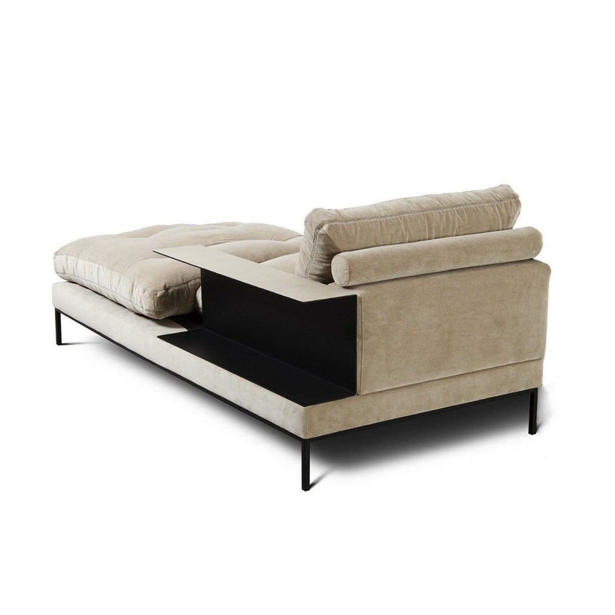 Ein charakteristisches Element des Study sind die langen, weichen Kissen, die sowohl als Sitzfläche als auch als Rückenlehne dienen. Zusätzlich sind sie mit zarten Steppungen und Knöpfen verziert, die dem Möbel Eleganz verleihen. Der Nutzungskomfort wird durch die silikonhaltigen Fasern, die die Kissen füllen, sowie durch spezielle Rollen, die hinter der Rückenlehne platziert sind und die Wirbelsäule unterstützen, gewährleistet.