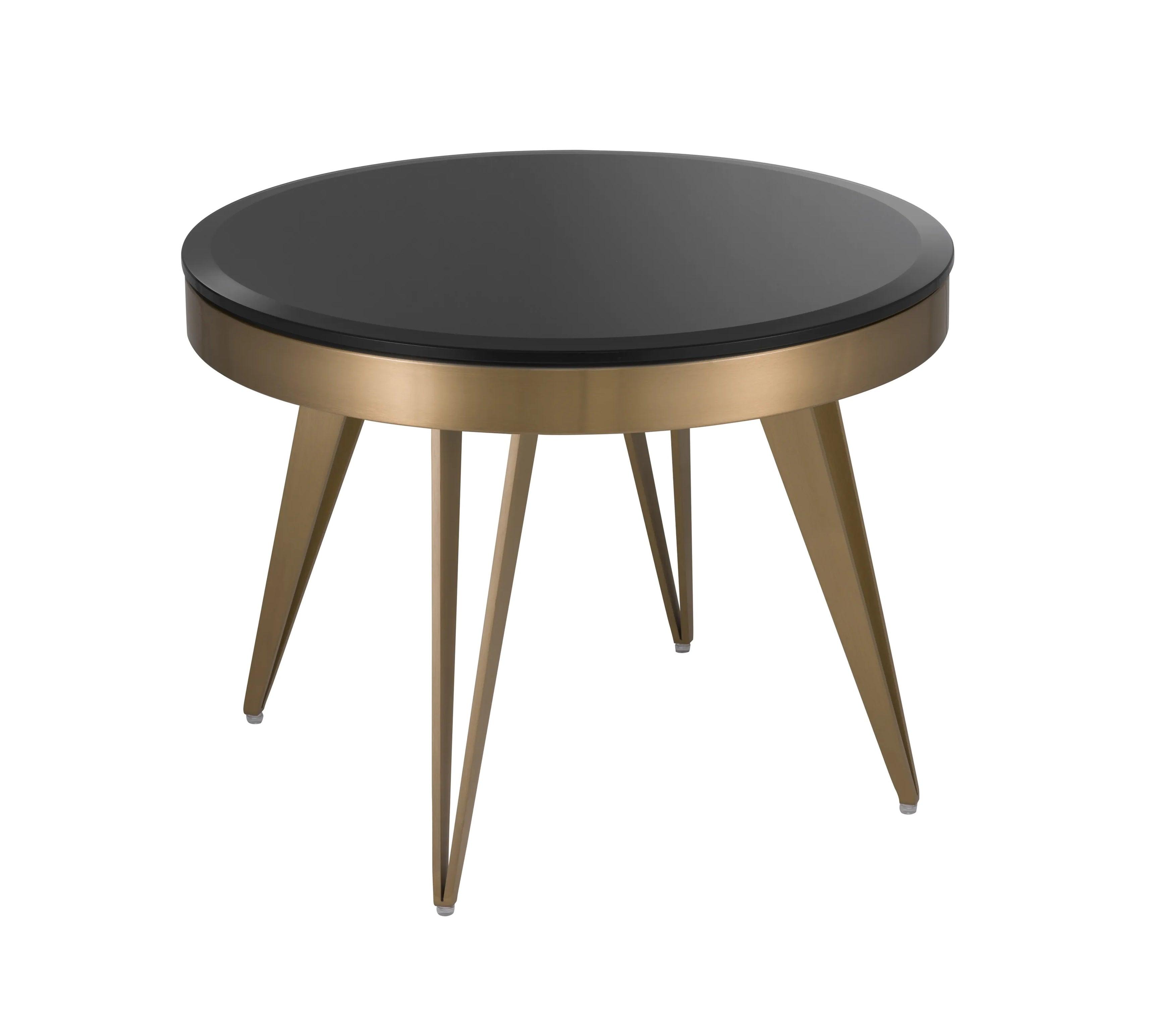 Beistelltisch Rocco ist die Quintessenz modernen Stils und Funktionalität. Angefangen bei den dreieckigen, durchbrochenen Beinen, deren Finish aus gebürstetem Messing ihnen einen eleganten Glanz verleiht, bis hin zur runden Tischplatte aus facettiertem schwarzem Glas - jedes Detail dieses Tisches wurde sorgfältig durchdacht, um Schönheit und Praktikabilität zu vereinen.