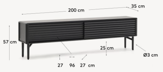 Fernsehschrank Lenon ist ein elegantes Möbelstück aus massivem Eichenholz mit einer schwarz gebeizten Oberfläche, das modernes Design mit Funktionalität verbindet. Ausgestattet mit 2 Schiebetüren und verstellbaren Füßen, bietet der Schrank einfachen Zugang und Anpassungsmöglichkeiten an verschiedene Oberflächen.