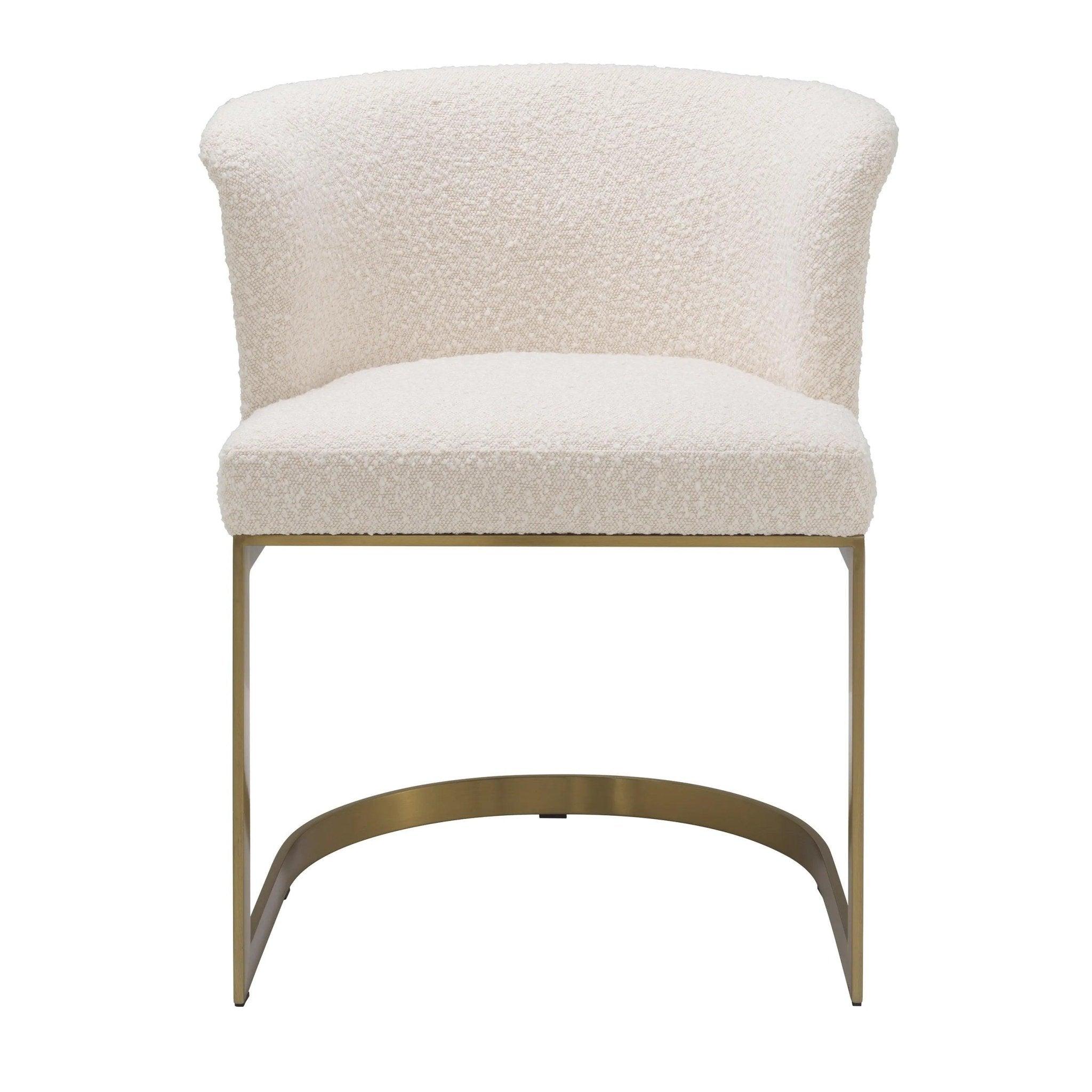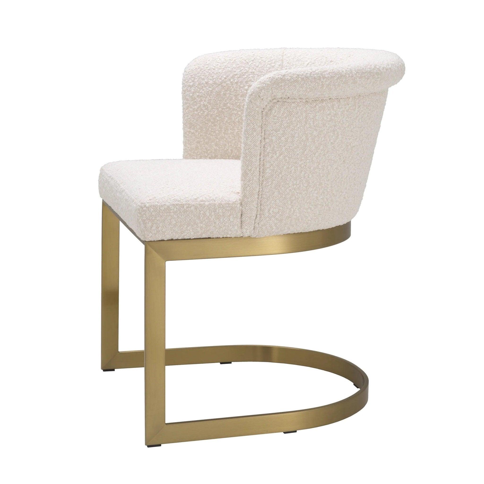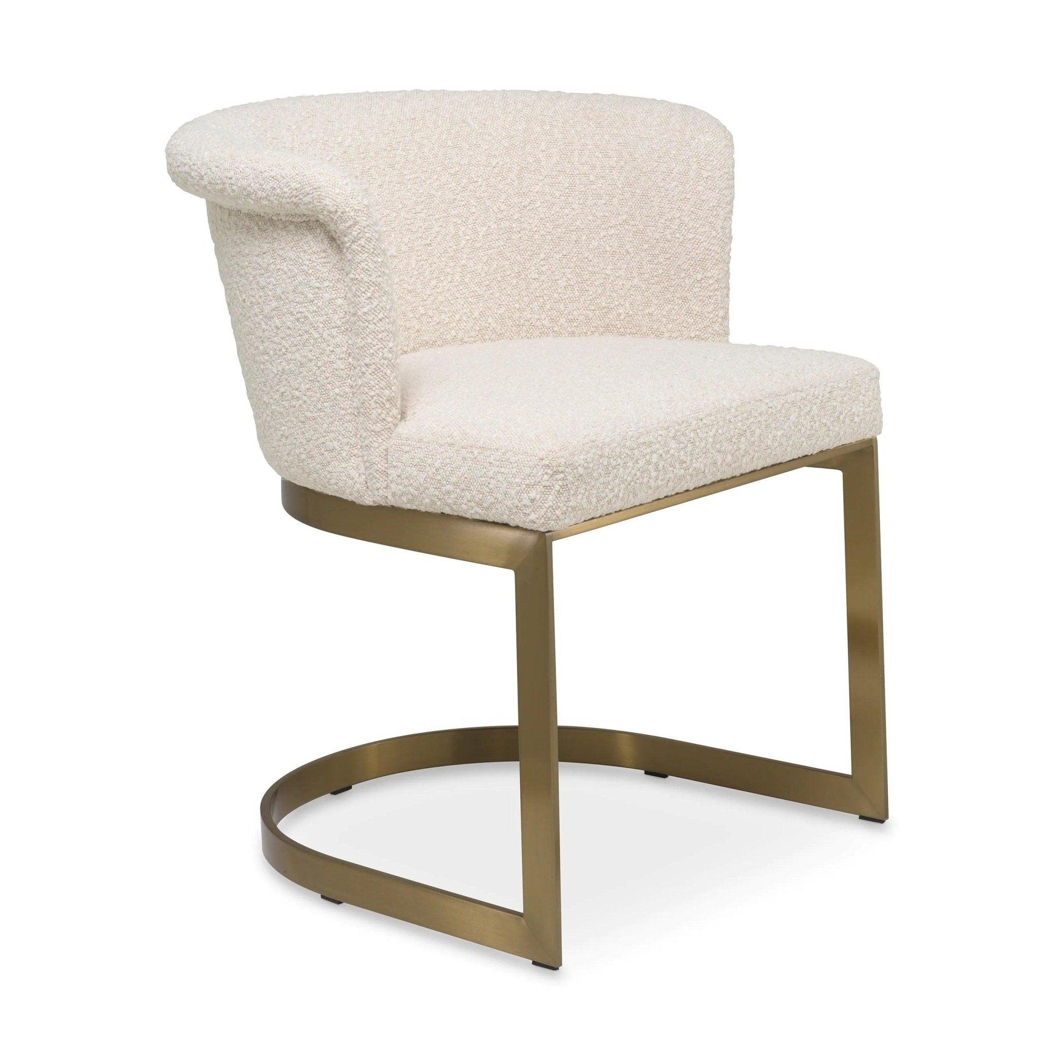 Das erste, was das Auge auffällt, ist sein einzigartiger Rahmen. In einem eleganten, gebürsteten Messing fährt es nicht nur Glanz, sondern auch langlebig und stabil. Dies ist die Grundlage, auf der ein luxuriöser Sitz ruht. Bouclé's Cream -Polster ist nicht nur ästhetisch attraktiv, sondern auch unglaublich komfortabel, ideal für ein langes Abendessen mit Familie oder Arbeiten am Schreibtisch.
