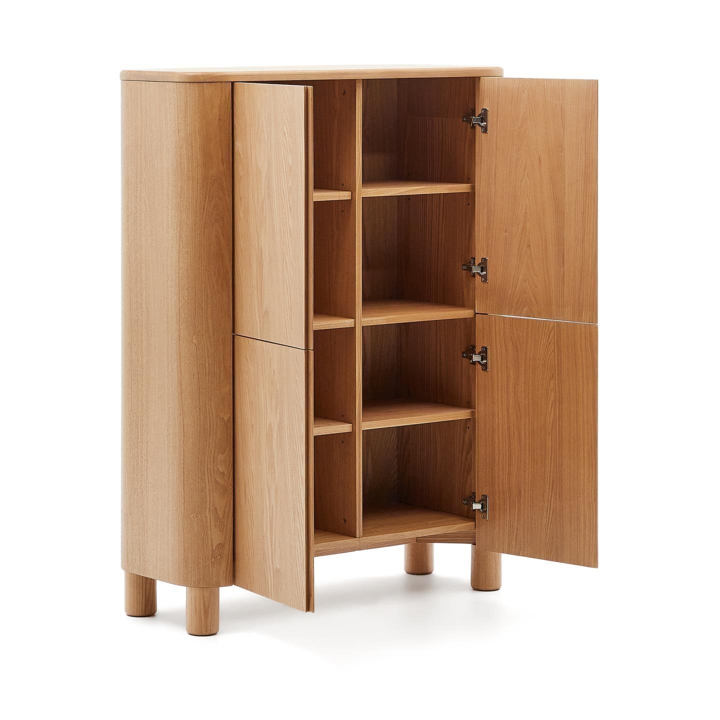 Salaya it Schrank, das sich durch sein außergewöhnliches Design unterscheidet - eine harmonische Kombination von geraden Linien mit dynamischer Krümmung der Seitenwände verleiht ihm ein einzigartiges Aussehen. Jede Kopie aus Aschenholz mit einem natürlichen Finish ausstrahlt ihre eigene Persönlichkeit und fügt einen einzigartigen Charakter hinzu. Stellen Sie dank Salay's High Sideboard Ihren Lebensraum Harmonie und Eleganz wieder her.