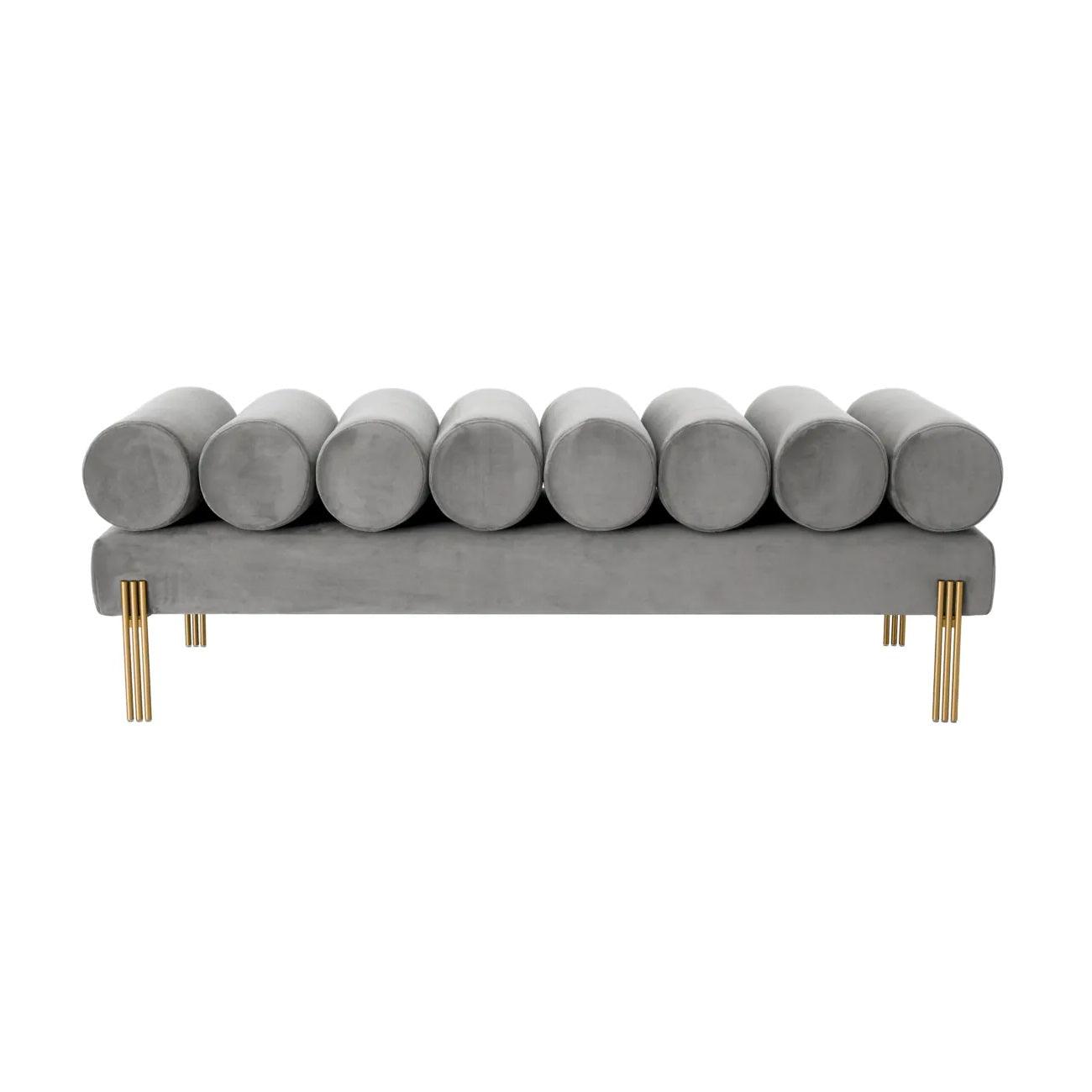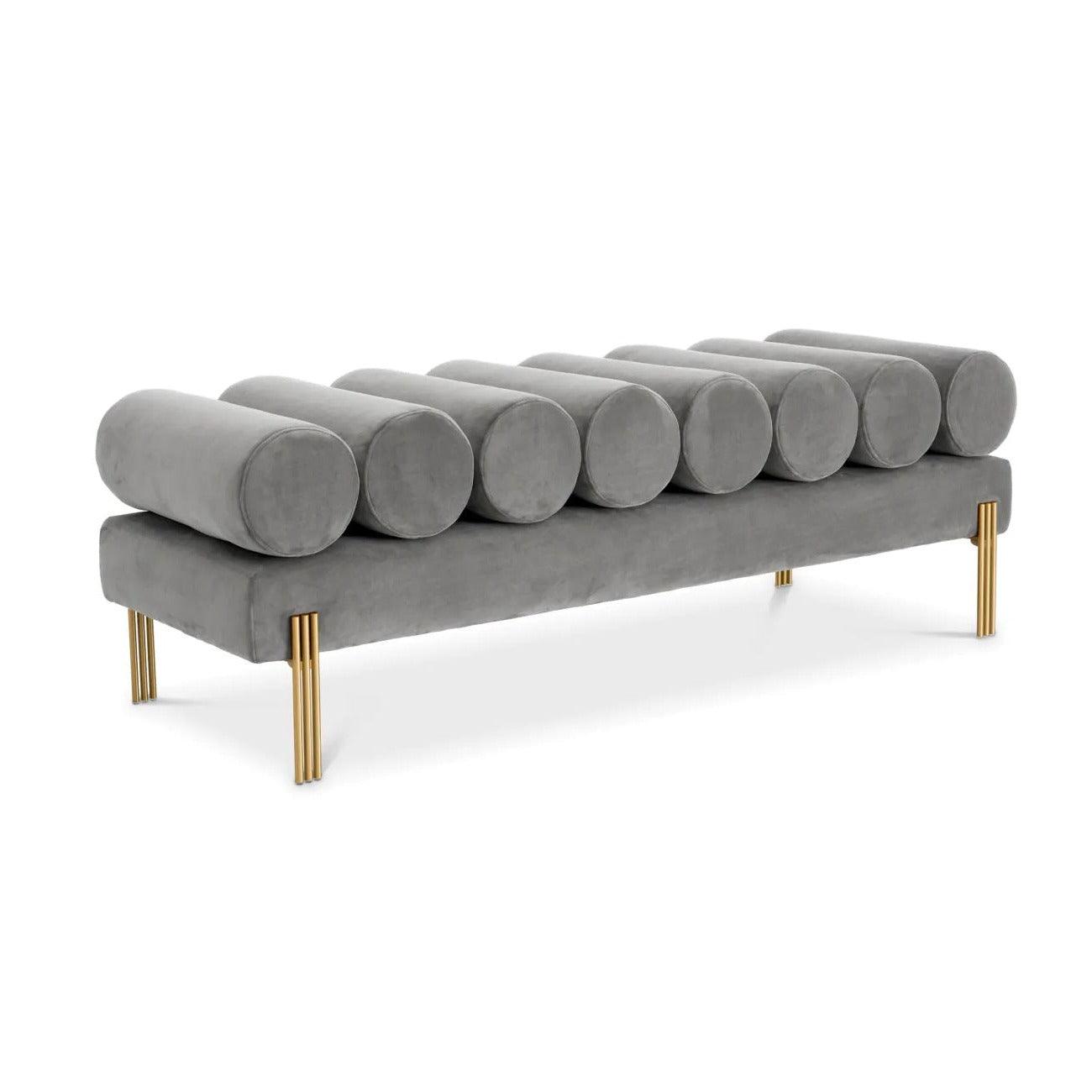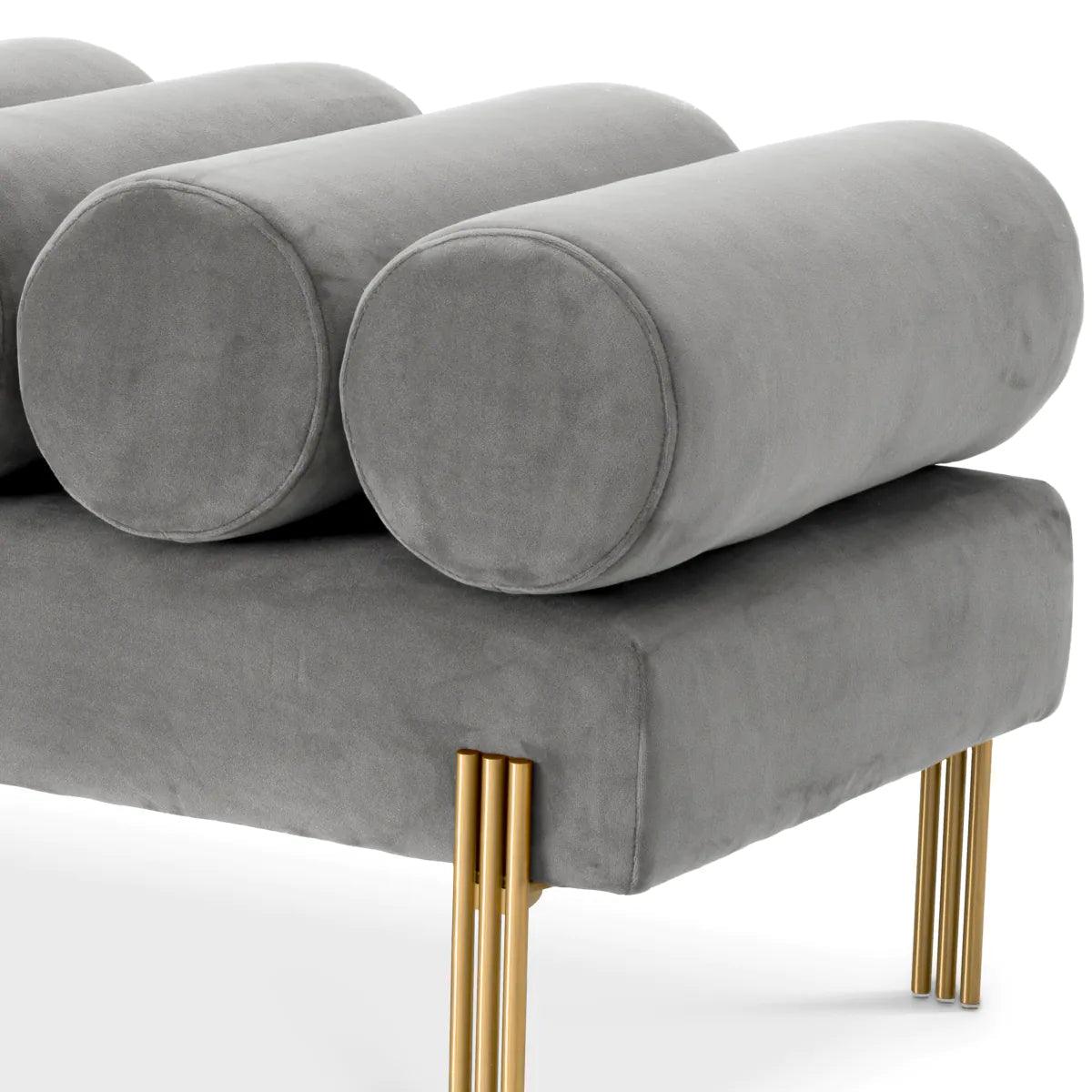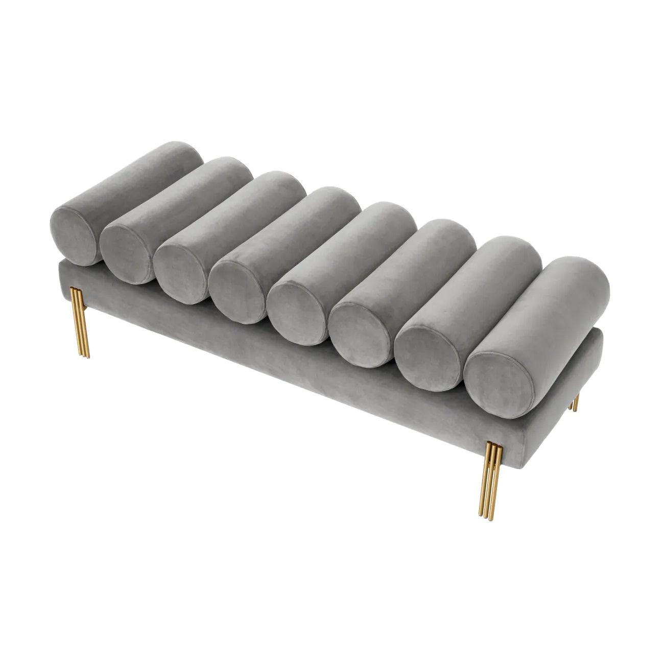 Die Ausführung aus gebürstetem Messing verleiht der Designerbank einen raffinierten, eleganten Akzent, der perfekt mit dem tiefen Farbton des grauen Samts harmoniert. Dieses Design, inspiriert von der Ästhetik der 50er Jahre des 20. Jahrhunderts, wird die Aufmerksamkeit jedes Gastes auf sich ziehen und Ihrem Interieur einen einzigartigen Charakter verleihen.