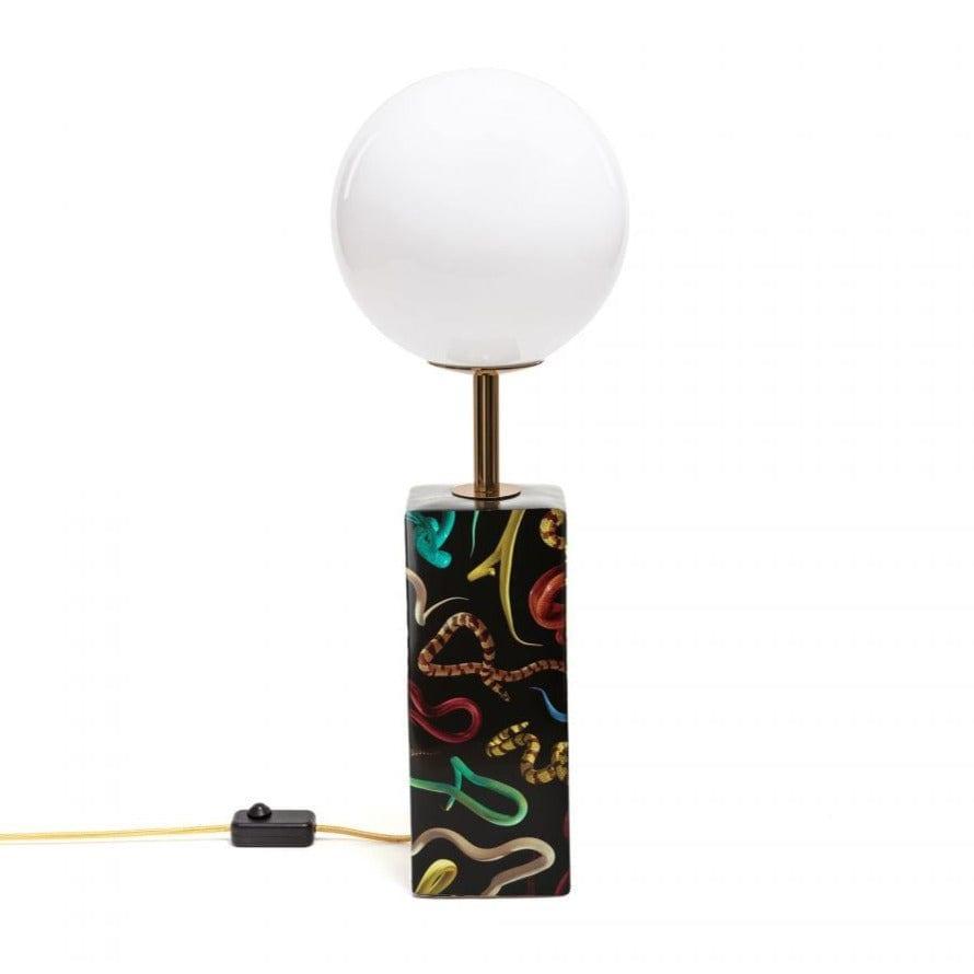 Schlangentischlampe bezieht sich auf die verrückten 60er Jahre. Entworfen vom italienischen König der Avant -Gartre - Seletti, wie ein Tor zu einer anderen, surrealen Dimension, verleiht dem Innenraum einen einzigartigen Charakter. Die Basis aus Porzellan, die volle Dynamik in Farben und eine leicht kontroverse Collage erzeugen ein originelles Kunstwerk.