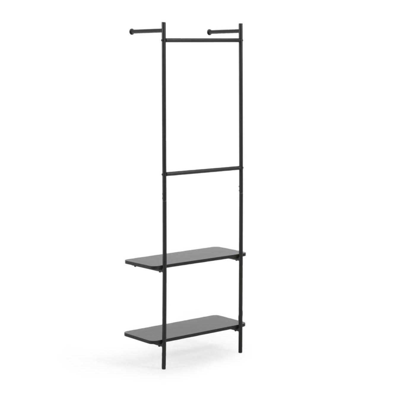 Wandgarderobe Galatia ist eine hervorragende Kombination aus Minimalismus, Eleganz und industriellem Stil, die Funktionalität in einen der klassischsten Designelemente – der Farbe Schwarz – bringt. Seine minimalistischen Linien harmonieren perfekt mit modernen Trends und verleihen dem Raum gleichzeitig einen raffinierten Akzent.