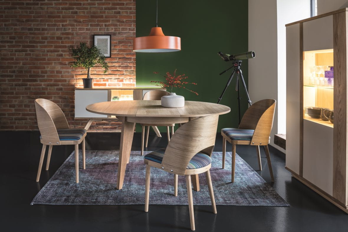 Der runde ausziehbare Tisch Senales von Fameg ist ein ideales Angebot für kleinere, moderne Innenräume, in denen Funktionalität und Eleganz eine Schlüsselrolle spielen. Der Entwurf von STROOG Andrzej Lękcoś zeichnet sich durch seine leichte, moderne Form und sein praktisches Ausziehsystem aus – durch den dreh- und kippbaren Einsatz (40 cm), der unter der Tischplatte verborgen ist, vergrößert sich der Durchmesser der Tischplatte von 115 cm auf 155 cm. Schlanke, schräge Beine aus Eichenholz verleihen dem Möbelstück optische Leichtigkeit und sorgen gleichzeitig für hervorragende Stabilität.