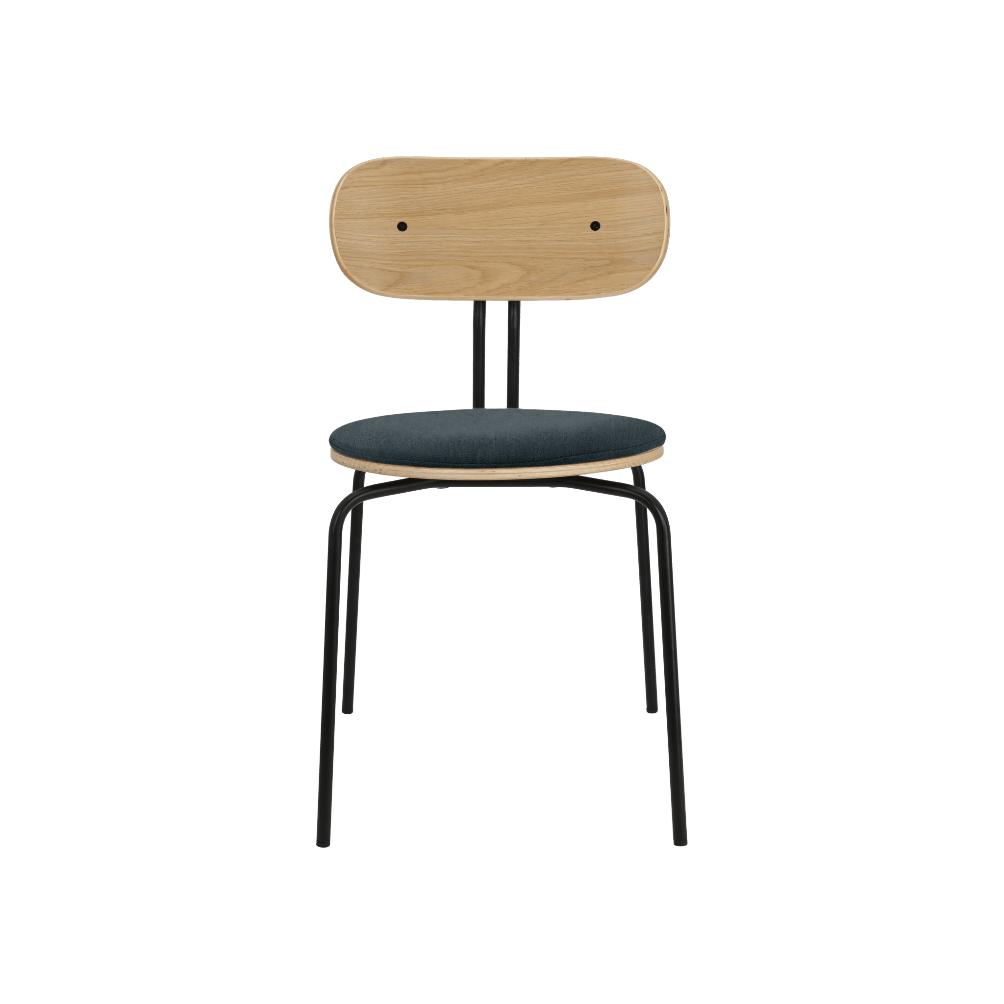 Stuhl Neugierig ist elegant, leichte und minimalistische Möbel aus Eichenfurnier. Es ist mit Messing- oder schwarzen Beinen erhältlich, und das optionale Sitzkissen bietet zusätzlichen Komfort. Sie können ein Kissen aus 17 Farben des Horizons -Stoffes auswählen, die 100% recycelt sind, sowie in einem braunen oder weißen Schatten mit Teddybärenstoff.
