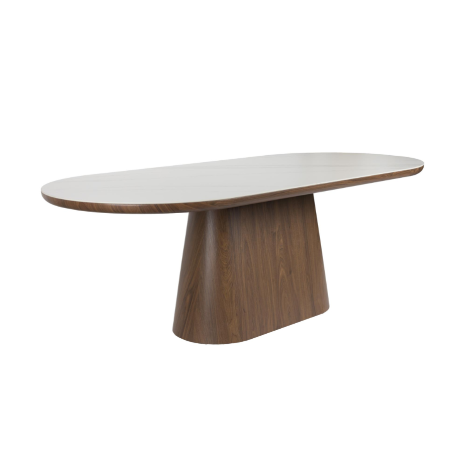 Der Almira Tisch von White Label Living ist ein elegantes Möbelstück mit raffinierter Ästhetik, das natürliches Finish mit modernen Materialien verbindet. Seine dezente Form besticht durch abgerundete Kanten und einen soliden, skulpturalen Sockel, der Stabilität und optische Leichtigkeit verleiht. Die mit einer dekorativen Marmor-Imitationsschicht überzogene Tischplatte harmoniert harmonisch mit der warmen Farbe des Sockels und schafft so eine ideale Komposition für moderne Ess- und Wohnzimmer.