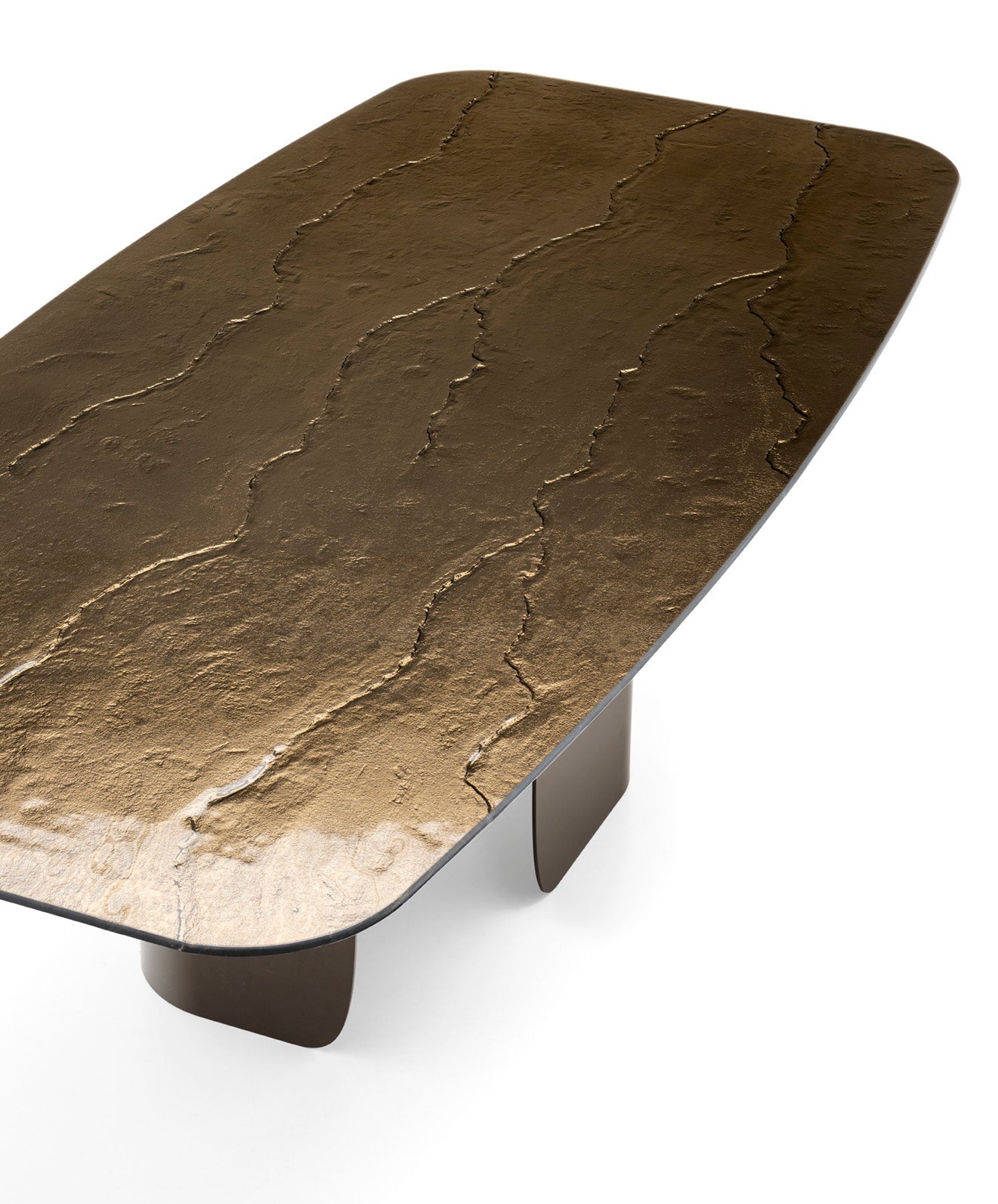 Die Tischplatte des Tisches Twins besteht aus Glas mit einer markanten, unregelmäßigen Struktur und einer dekorativen, metallischen Oberfläche. Ihre Fläche, inspiriert von natürlichen Rissen und Abnutzungen, verleiht dem Gesamtbild einen künstlerischen Charakter und hebt die Einzigartigkeit des Designs hervor. Diese Kombination aus kräftiger, ausdrucksvoller Textur und eleganter Form verleiht dem Tisch Twins eine skulpturale, fast sammelwürdige Ästhetik, die ideal für Räume ist, in denen Design eine Schlüsselrolle spielt.