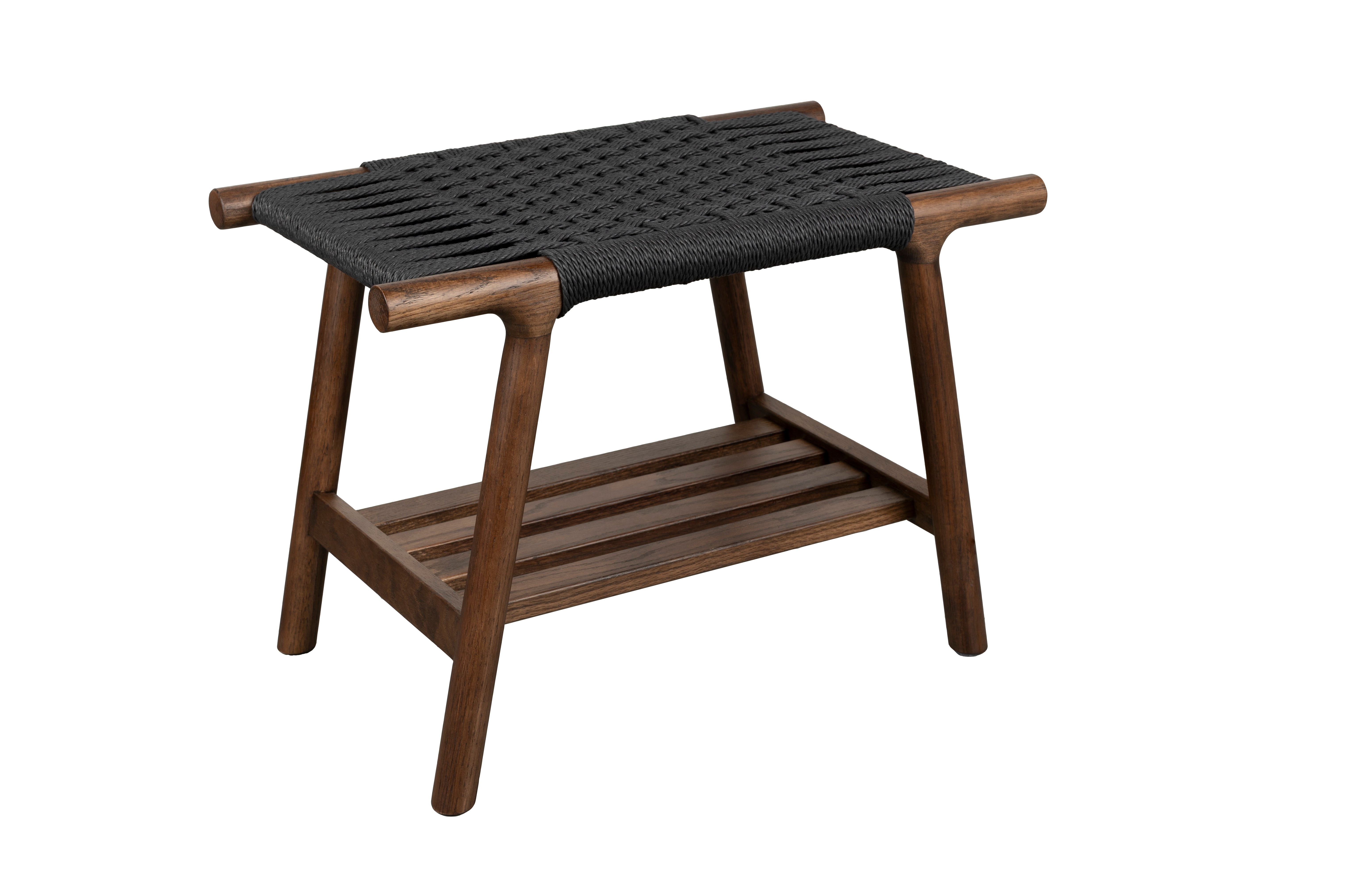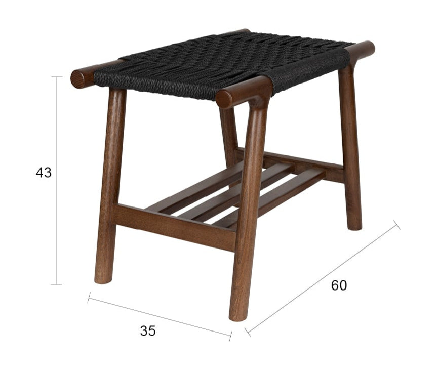 Der Hocker Kintaro in Nussbaum-Finish ist ein kompakter Möbelstück, das einen warmen 70er-Jahre-Flair in Ihr Zuhause bringt. Hergestellt aus massivem Eichenholz und wunderschön in einem tiefen Nussbaumton verarbeitet, begeistert er mit organischen Linien und abgerundeten Kanten. Das größte Highlight ist der charakteristische Sitz aus geflochtenem Schnur, in dem sich horizontale und vertikale Stränge zu einem beeindruckenden Muster verweben. Unter dem Sitz befindet sich ein praktisches Regal aus Latten, das sich hervorragend zur Aufbewahrung von Schuhen, Büchern oder kleinen Gegenständen eignet.