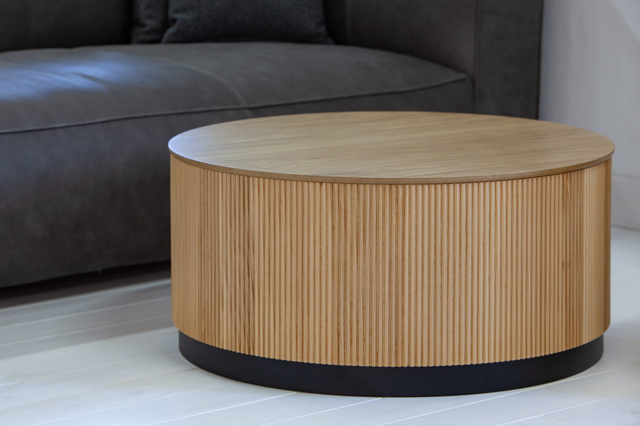 Eleganter Couchtisch Rill aus natürlichem Eichenfurnier ist eine hervorragende Möglichkeit, Wärme und natürlichen Charakter in Ihr Zuhause zu bringen. Die runde Tischplatte in natürlicher Farbgebung kontrastiert wunderschön mit dem geriffelten Fuß und dem subtilen Metallring und schafft ein harmonisches Gesamtbild im modernen Stil. Seine kompakte Form macht ihn auch ideal für kleinere Räume.