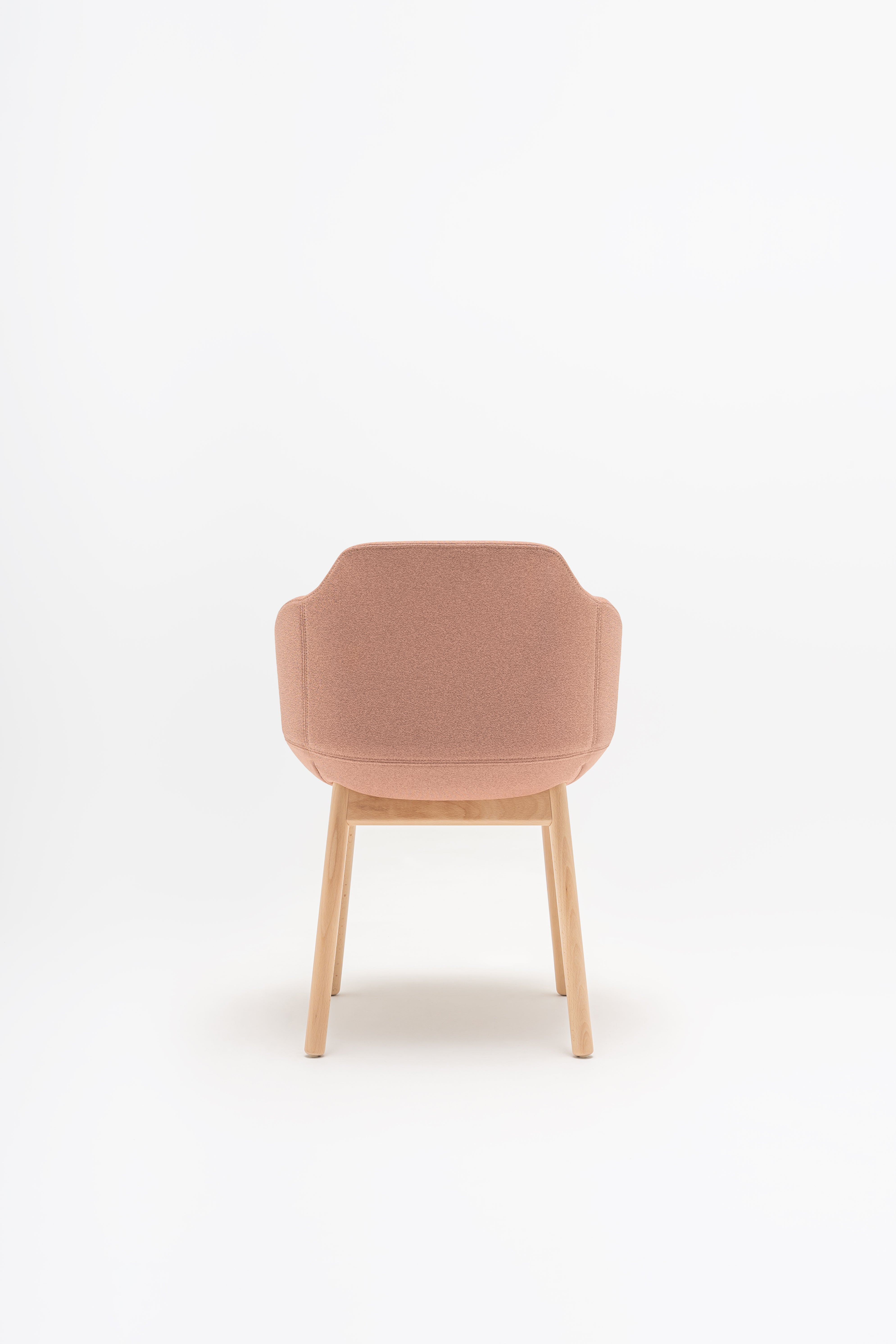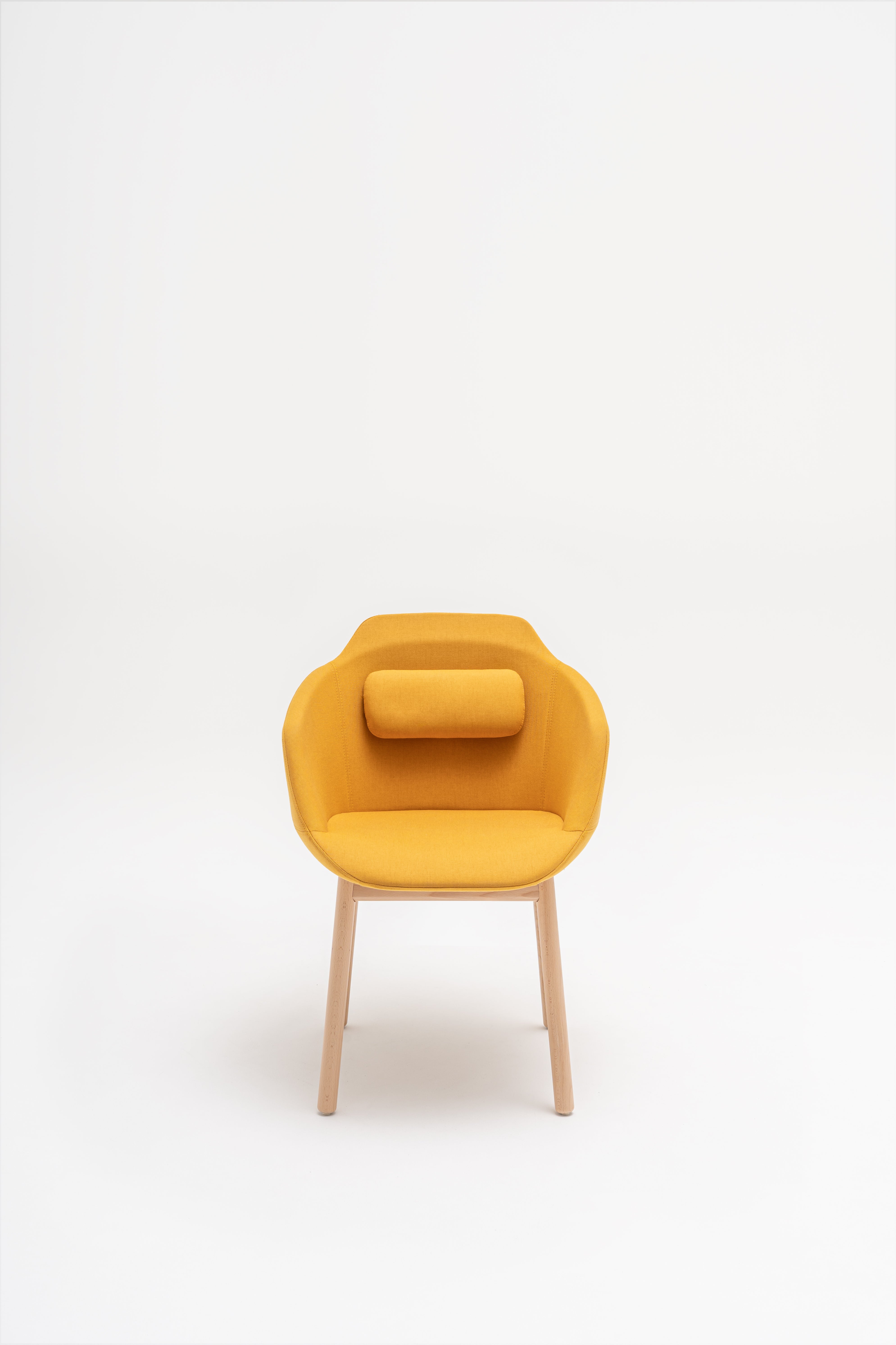 Stuhl Ultra mit einer Holzbasis, die von Krystian Kowalski entworfen wurde, ist eine domestizierte Version des Modells, die die Funktionalität mit einem gemütlichen Design kombiniert. Das charakteristische gepolsterte Kissen, das am Rücken befestigt ist, erhöht den Komfort des Gebrauchs, und die vier legierte Basenbasis fügt Wärmestuhl und Eleganz hinzu. Dank dessen ist Ultra nicht nur in Büros, sondern auch in Wohnräumen und gastronomischen Räumlichkeiten perfekt. Es ist ein vielseitiges Möbel, ideal für Konferenzräume, Esszimmer und Urlaubszonen.