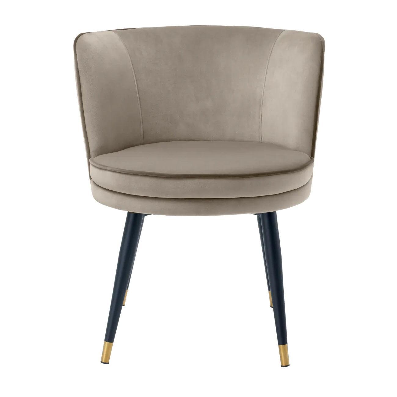 Eines der ersten Elemente, die ins Auge fallen, sind seine schwarzen, konisch zulaufenden Beine. Diese subtile Anspielung auf klassisches Design verleiht dem gesamten Stuhl Eleganz. Darüber hinaus sind die Beine mit goldenen Auflagen verziert, die ihnen einen besonderen Glanz und eine luxuriöse Ausführung verleihen. Dieser Stuhl wird mit Sicherheit die Aufmerksamkeit jedes Gastes auf sich ziehen.