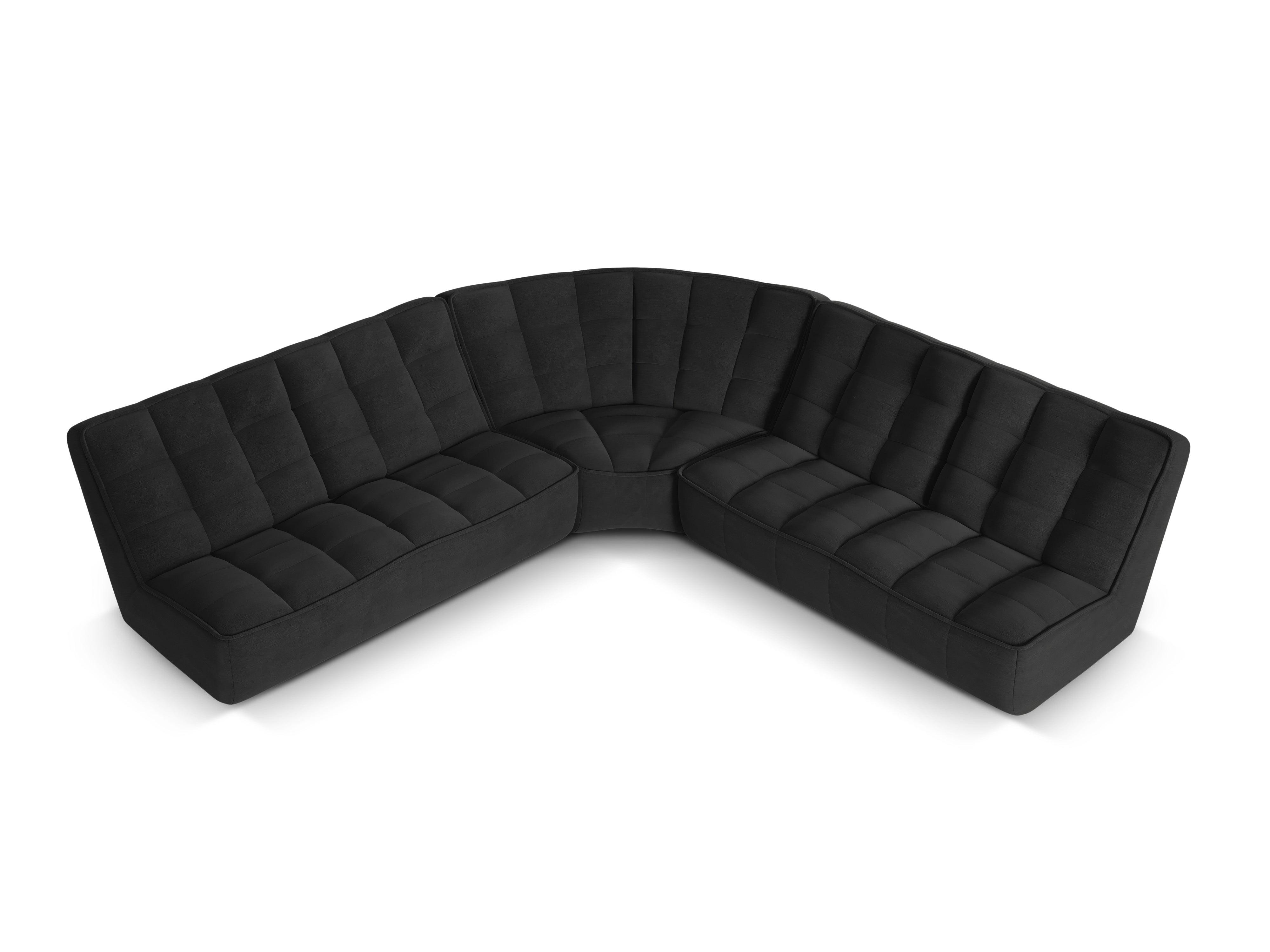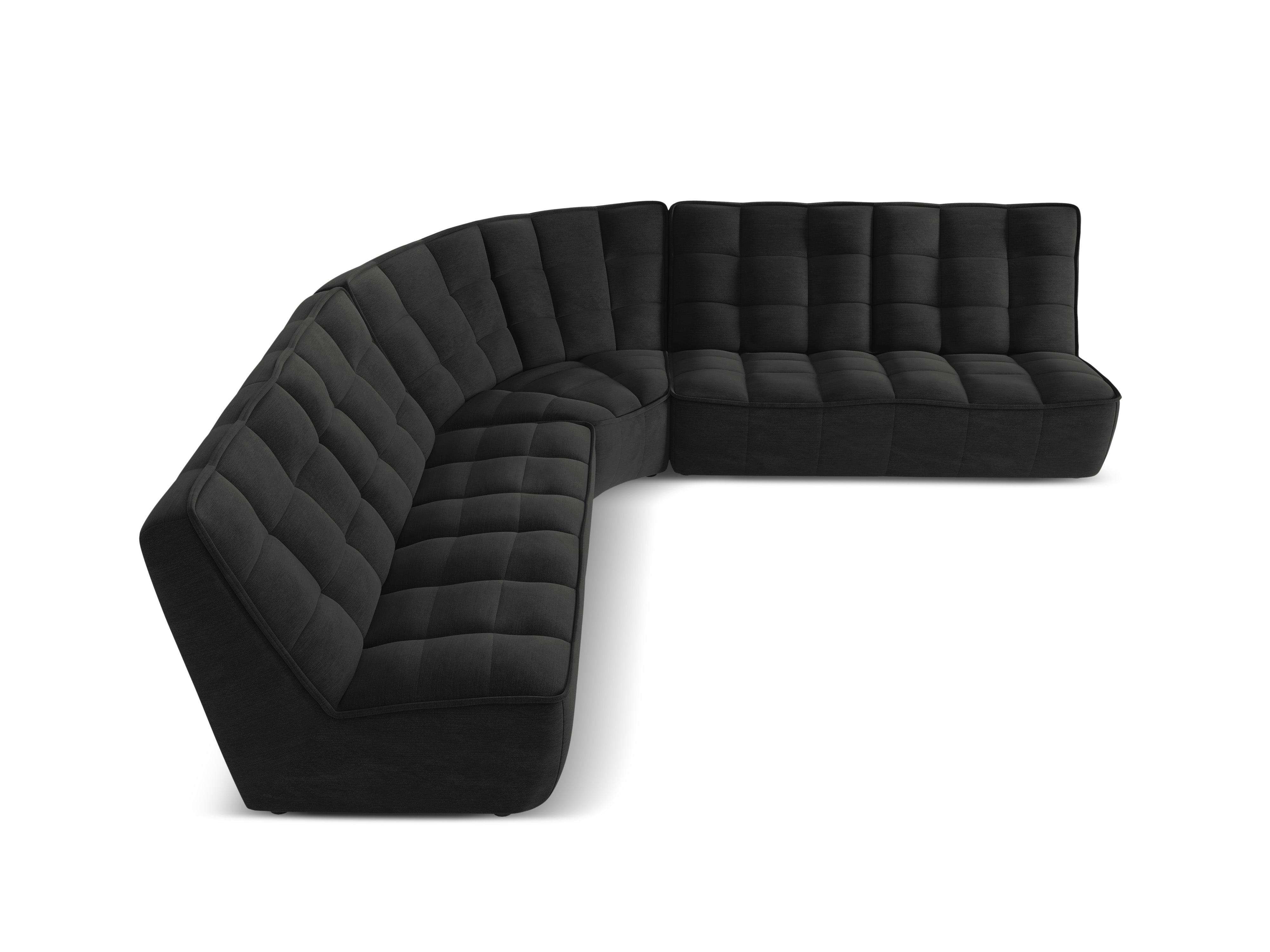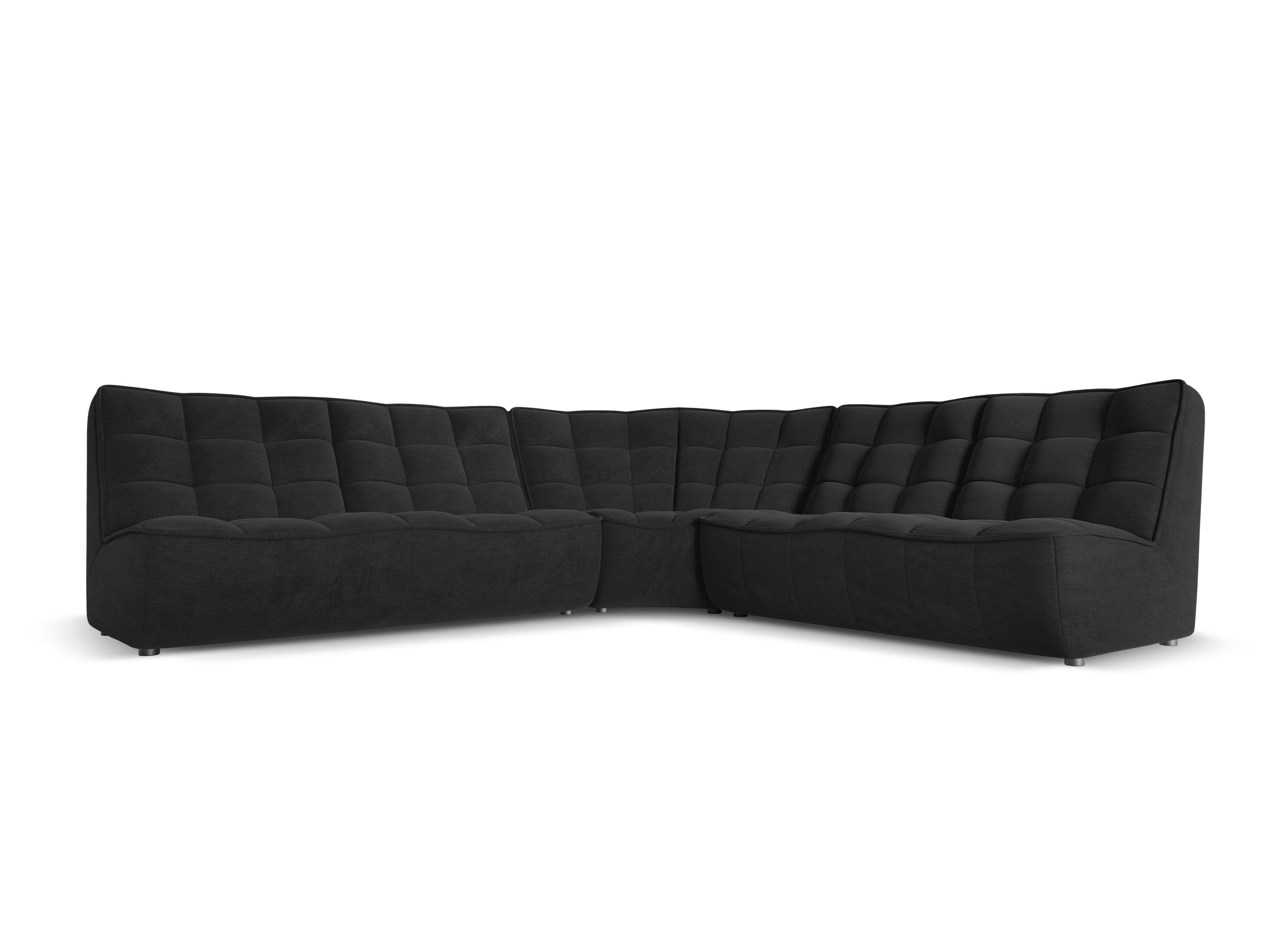 Ecksofa für sechs Personen Moni definiert Funktionalität und Komfort in Kombination mit modernem Design. Stilvolle Steppung und die originelle Form eignen sich sowohl für ein elegantes Wohnzimmer als auch für ein modernes Büro. Die Linie der Sitzfläche und der Rückenlehne ist bogenförmig und verfügt über eine sanft geformte Vertiefung, die außergewöhnlichen Nutzungskomfort bietet.