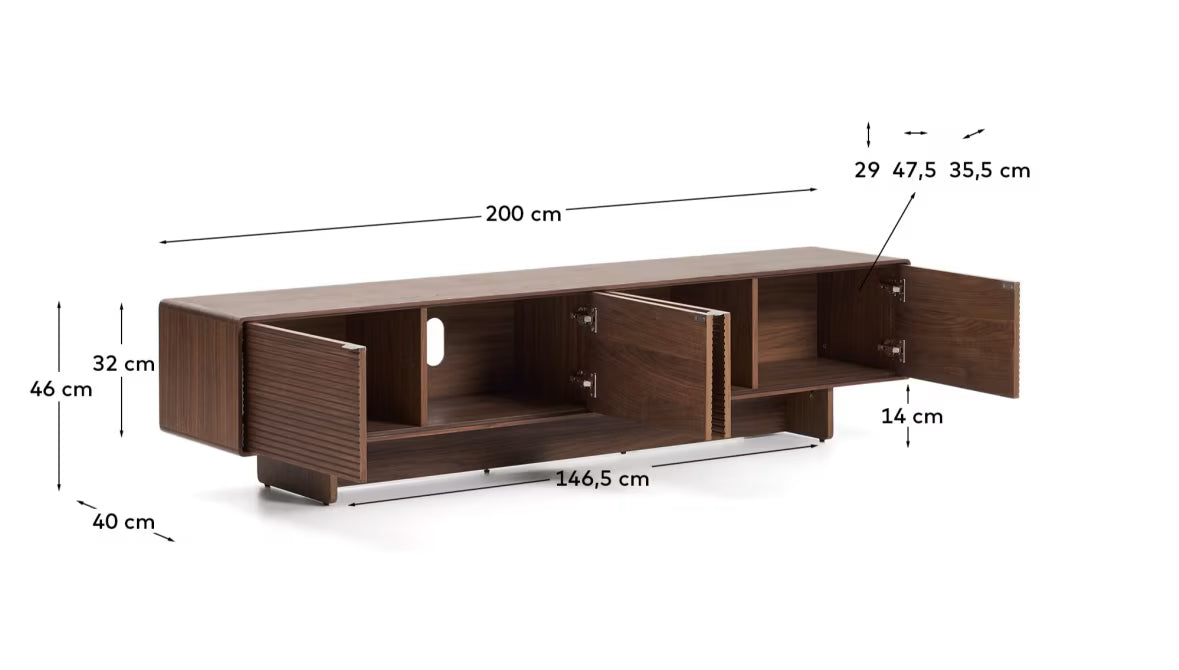 Szafka RTV została wykonana z płyty MDF wykończonej fornirem orzechowym, który nadaje jej elegancki, naturalny wygląd. Drzwi wyposażono w zawiasy z funkcją cichego domykania, a półki są regulowane, co zwiększa funkcjonalność mebla. Blat ma grubość 10 mm, pokryty jest lakierem poliuretanowym, który chroni powierzchnię przed wilgocią i zużyciem. Uchwyty z satynowej stali nierdzewnej mają skośny kształt ułatwiający chwyt, a ich szczotkowana powierzchnia jest odporna na ślady palców i zarysowania. Tylny panel posiada otwór na kable, co ułatwia organizację sprzętu multimedialnego. Certyfikowane drewno FSC Mix Credit potwierdza odpowiedzialne pochodzenie surowców.