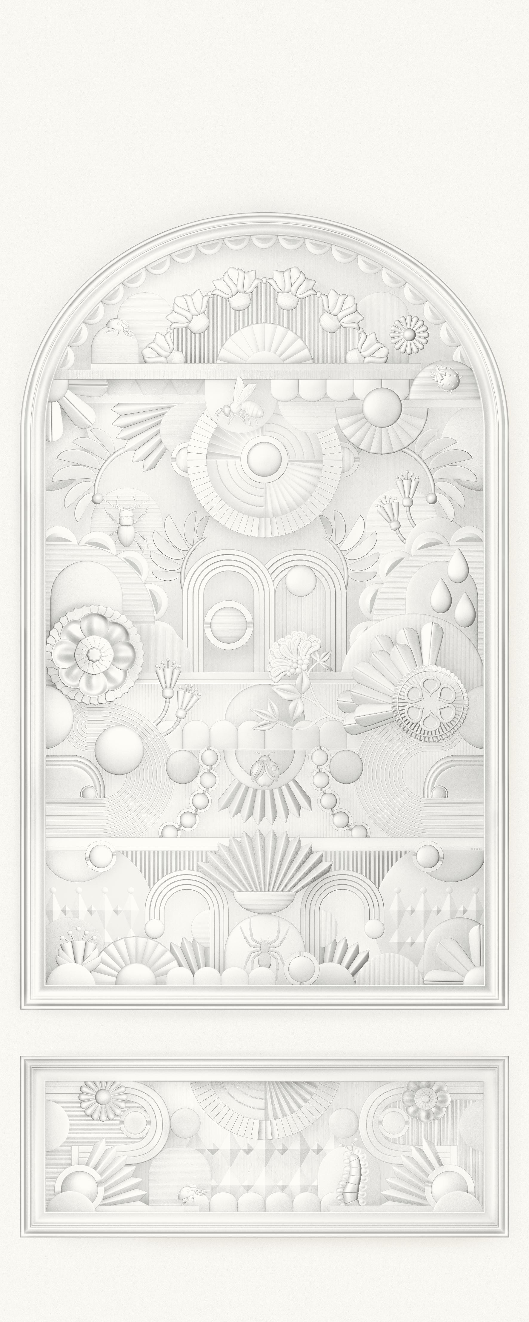 Mural Greenhouse Gathering Arch ist eine außergewöhnliche Wanddekoration, inspiriert von dekorativer Stuckkunst und der Ästhetik des Art Deco. Die monochrome Komposition erinnert an klassische Gipsformen und architektonische Details und schafft einen Effekt subtiler Eleganz. Das Motiv spielt auf den Blick durch die Glasfenster eines Gewächshauses an und enthüllt den Reichtum üppiger Blumen und dekorativer Strukturen, wodurch das mural perfekt in luxuriöse und zeitlose Inneneinrichtungen passt.