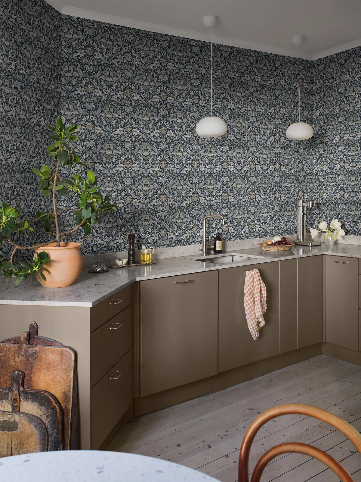 Tapete Blomsterfröjd ist ein eleganter Vorschlag mit raffiniertem und zeitgenössischem Charakter, inspiriert von der Arts and Crafts-Ästhetik. Das dichte, dekorative Pflanzenmuster bildet eine reiche Komposition, die sich eindrucksvoll an den Wänden entfaltet und dem Raum Gemütlichkeit und Tiefe verleiht. Das Gesamtbild begeistert mit Details und harmonischer Anordnung und bringt eine außergewöhnliche Atmosphäre in den Raum.