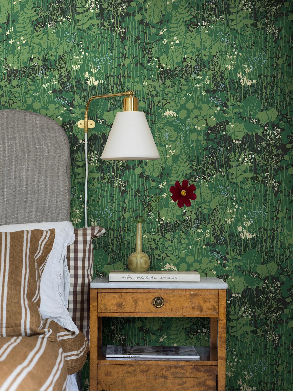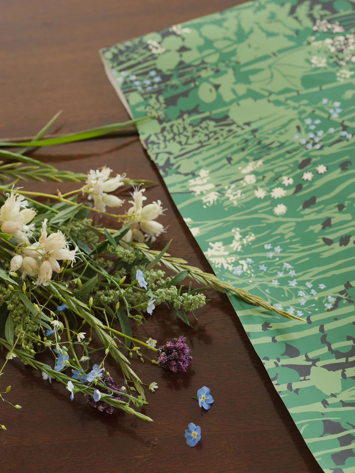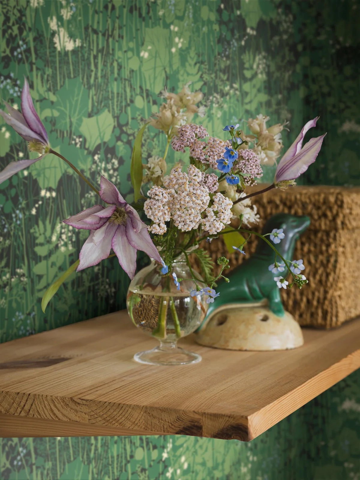 Tapete Dikesren ist eine Hommage an die Natur, die dank des Pflanzenmotivs an den Wänden zum Leben erwacht. Inspiriert von einer üppigen, grünen Küste zeigt die Tapete Farne, Vergissmeinnichte und wilde Blumen vor einem tiefgrünen Hintergrund. In der Technik des Oberflächen-Drucks gefertigt, bringt die Tapete eine reiche Textur und die Ruhe eines skandinavischen Sommers in den Raum.