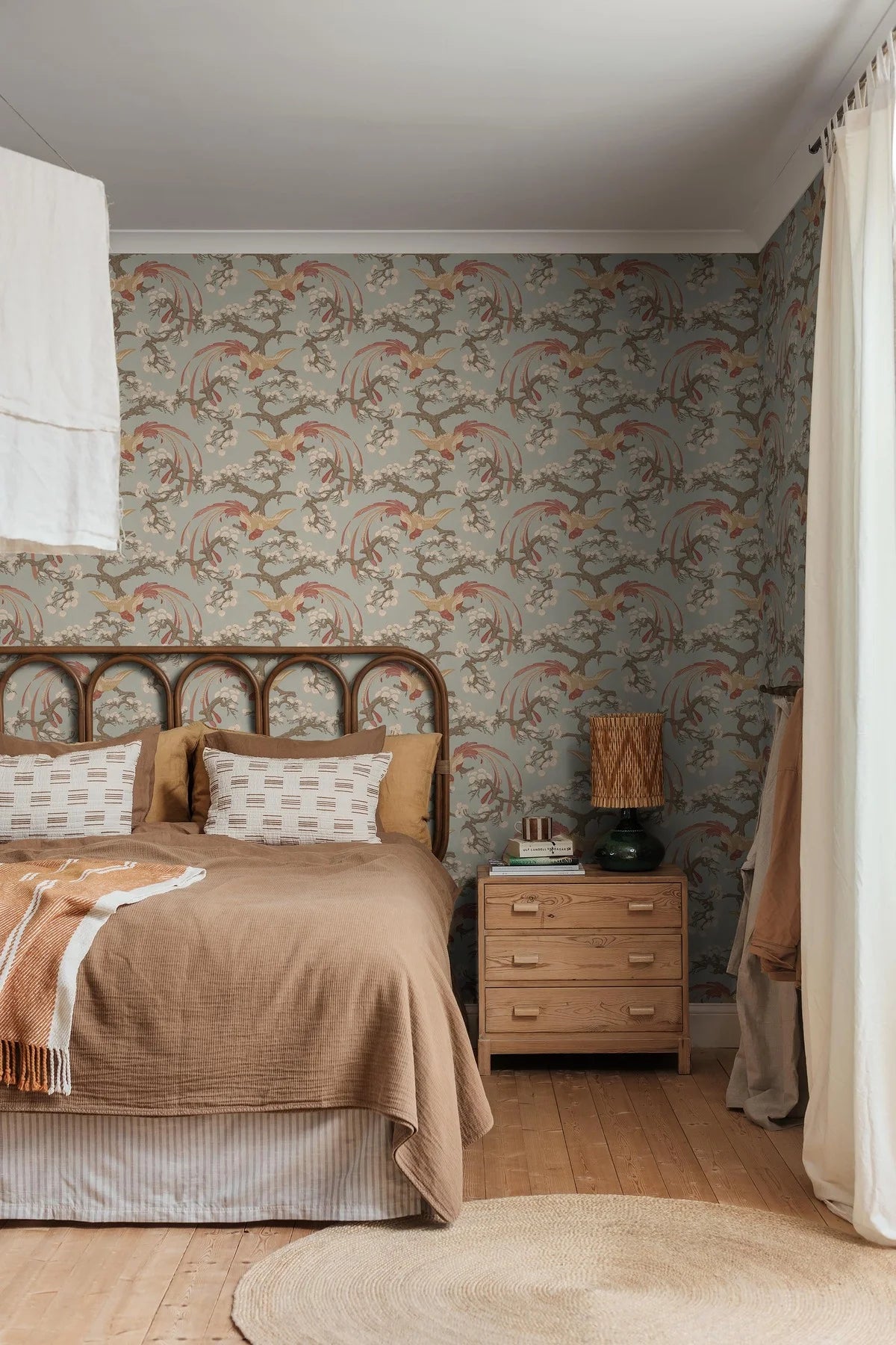Tapete Fenix ist ein eleganter Vorschlag, inspiriert von asiatischer Dekorationskunst, der Harmonie und natürliche Schönheit in den Raum bringt. Handgezeichnete Vögel und zarte Pflanzenmotive schaffen eine ruhige, ausgewogene Komposition, die den Wänden Leichtigkeit und einen raffinierten Charakter verleiht. Das Muster verbindet Subtilität mit Dekorativität und erzeugt einen zeitlosen Effekt.