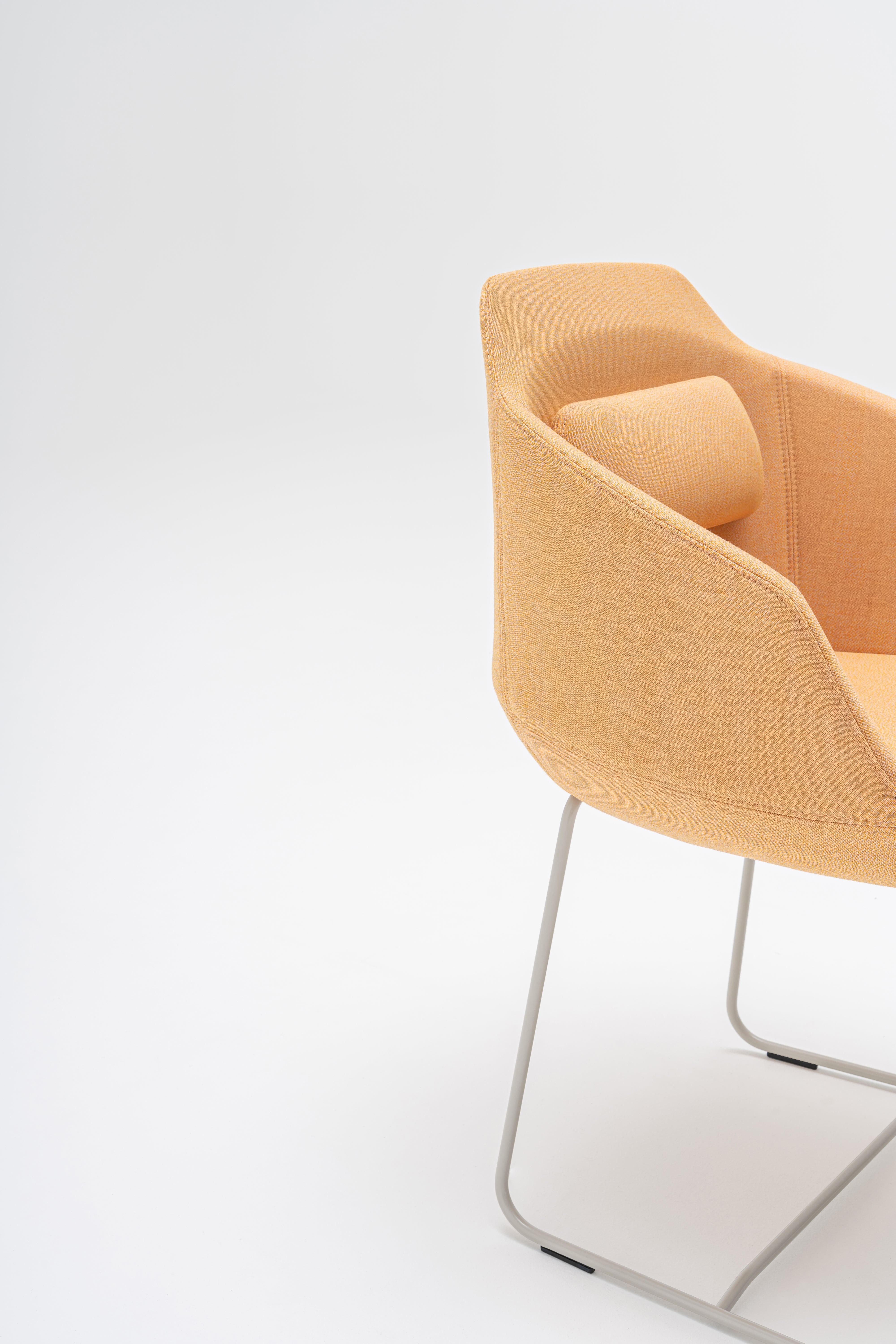 Stuhl Ultra mit einer Basis in Form von Skids ist eine perfekte Kombination aus hoch entwickeltem Design und Ergonomie, die für den Nutzerkomfort erstellt wurde. Das charakteristische gepolsterte Kissen auf der Rückenlehne erhöht nicht nur den Komfort, sondern macht auch mit einem einzigartigen Design Aufmerksamkeit auf sich. Dank der ungewöhnlichen Basis ist Ultra ideal für Büro-Urlaubszonen und Besprechungsräume. Die schlanke Basis steht im Gegensatz zu einem breiten Sitz und schafft eine harmonische und moderne Figur.
