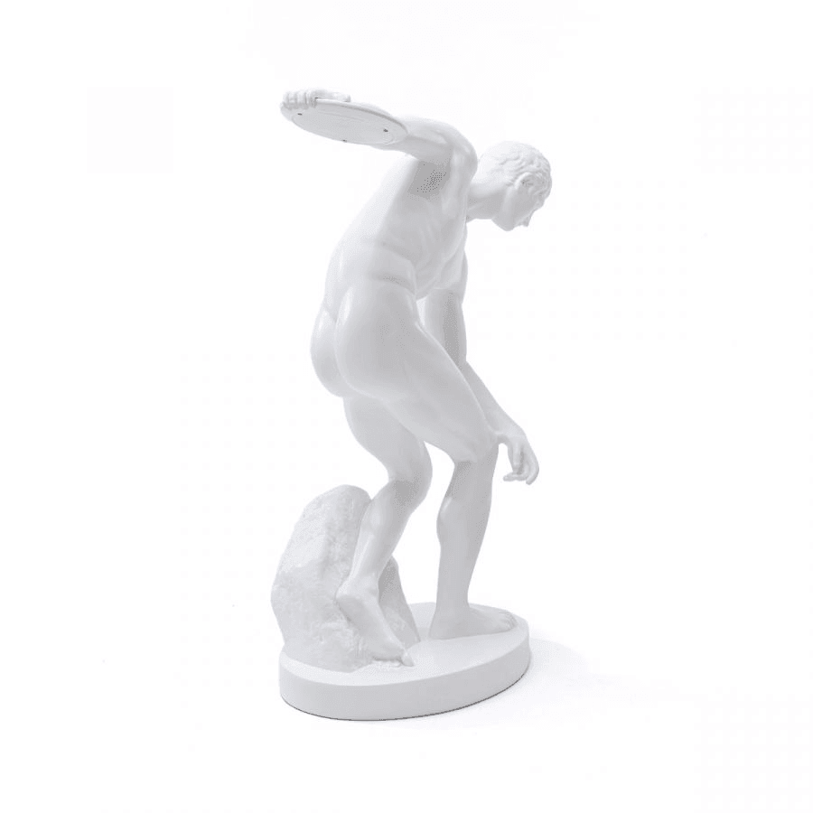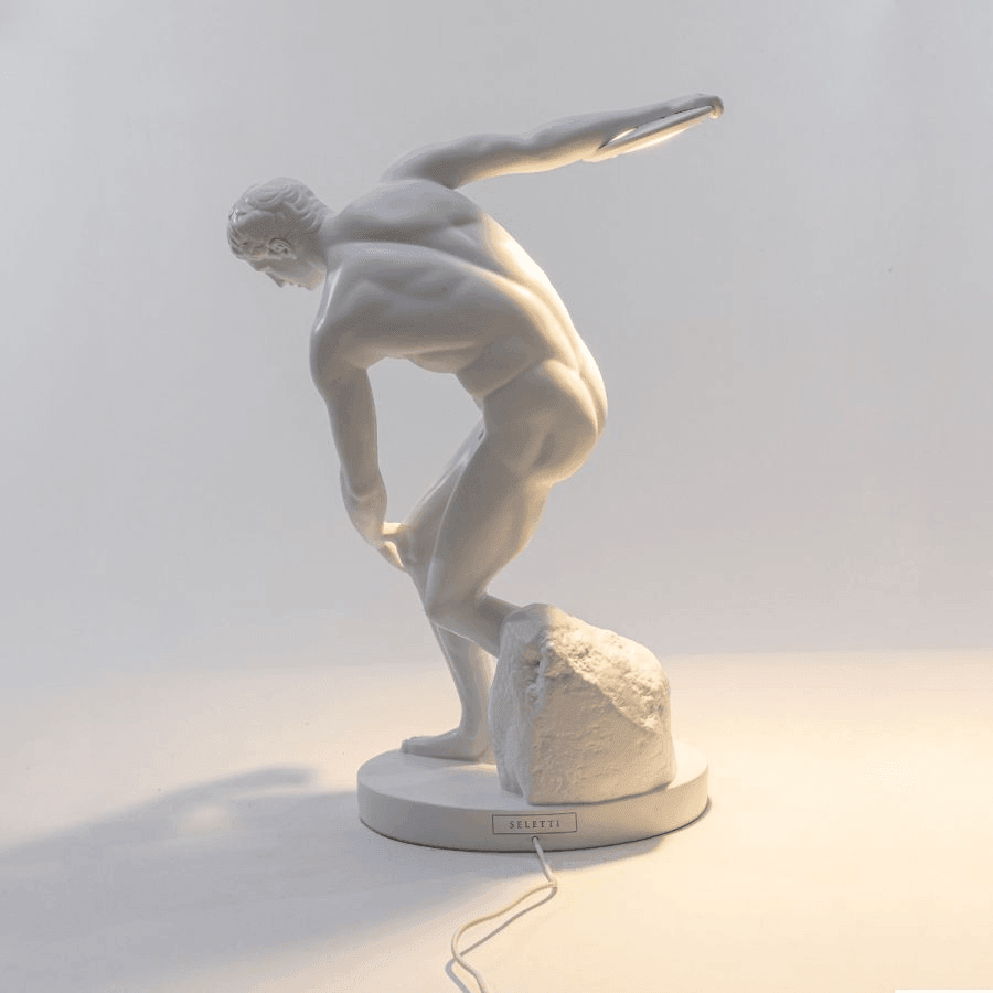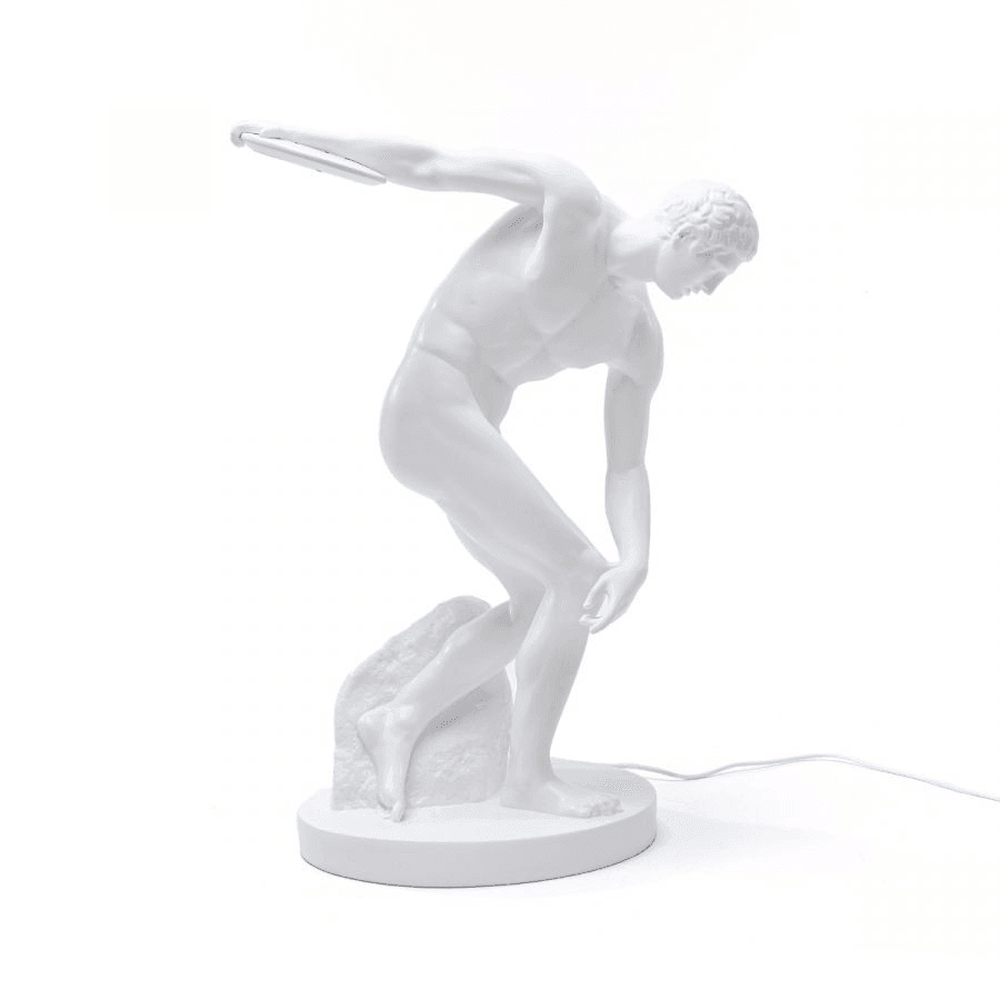 Lampe Discobolux wird bei jedem Liebhaber mutiger und eklektischer Accessoires einen bleibenden Eindruck hinterlassen. Die Lampe basiert auf der berühmten griechischen Skulptur von Myron, die niemandem vorgestellt werden muss. Der Körper des Athleten, der den Diskus wirft, nimmt eine perfekte Pose ein, weshalb diese Skulptur seit Tausenden von Jahren große Beliebtheit genießt.