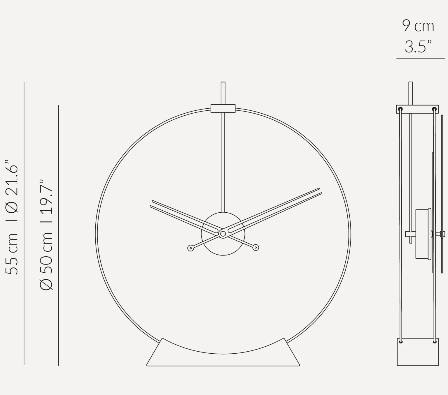 Materiały: polerowany mosiądz, drewno jesionowe barwione na orzech (podstawa i wskazówki), czarne włókno szklane (obręcz), mechanizm UTS German