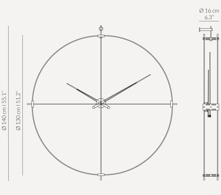 Delmori verbindet architektonische Größe mit subtiler Detailverarbeitung. Sie ist in einer Version mit verchromtem Messing oder in einer Variante mit poliertem Messing erhältlich, und der Rahmen ist in Schwarz gehalten. Es handelt sich um eine designorientierte Wanduhr, die dank des deutschen UTS-Mechanismus präzise und leise funktioniert und dabei ihren skulpturalen Charakter bewahrt.