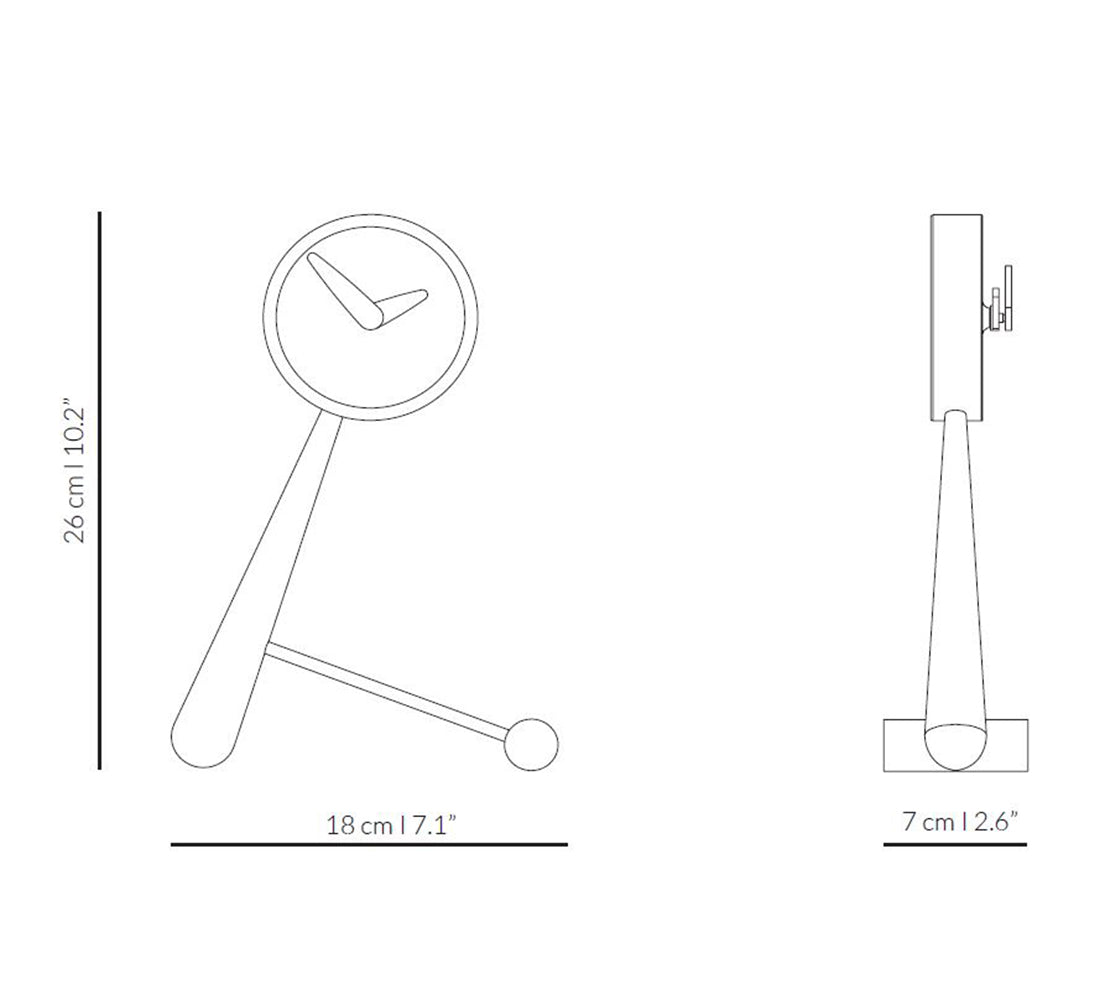Tischuhr Mini Puntero ist eine raffinierte, skulpturale Form, die die Blicke auf sich zieht und den Charakter des Raumes unterstreicht. Diese Uhr mit einem Durchmesser von 10 cm und einer Höhe von 26 cm vereint natürliches Nussbaumholz mit einer eleganten, metallischen Front in poliertem Messing oder graphitfarbenem Messing. Die schlanke Stütze und das dekorative Detail im unteren Bereich machen die designorientierte Tischuhr nicht nur zu einem funktionalen Accessoire, sondern auch zu einem kleinen Kunstwerk.