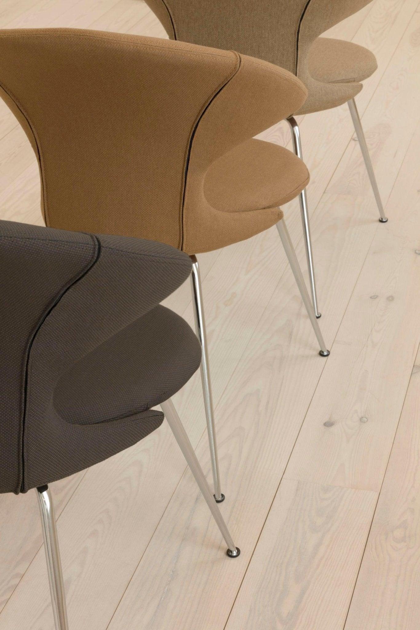 Der Stuhl ist in 17 sorgfältig ausgewählten Farben des Stoffes Horizons erhältlich, der zu 100 % aus recyceltem Material besteht oder in 2 Stoffen aus der Teddy-Kollektion. Darüber hinaus umfassen die Optionen für die Beine Messing-, verchromte oder schwarze Oberflächen, was es ermöglicht, den Stuhl an verschiedene Einrichtungsstile anzupassen. Diese Kombination aus Ästhetik, Funktionalität und nachhaltigem Materialansatz macht Time Flies zu einem einzigartigen und langlebigen Angebot.