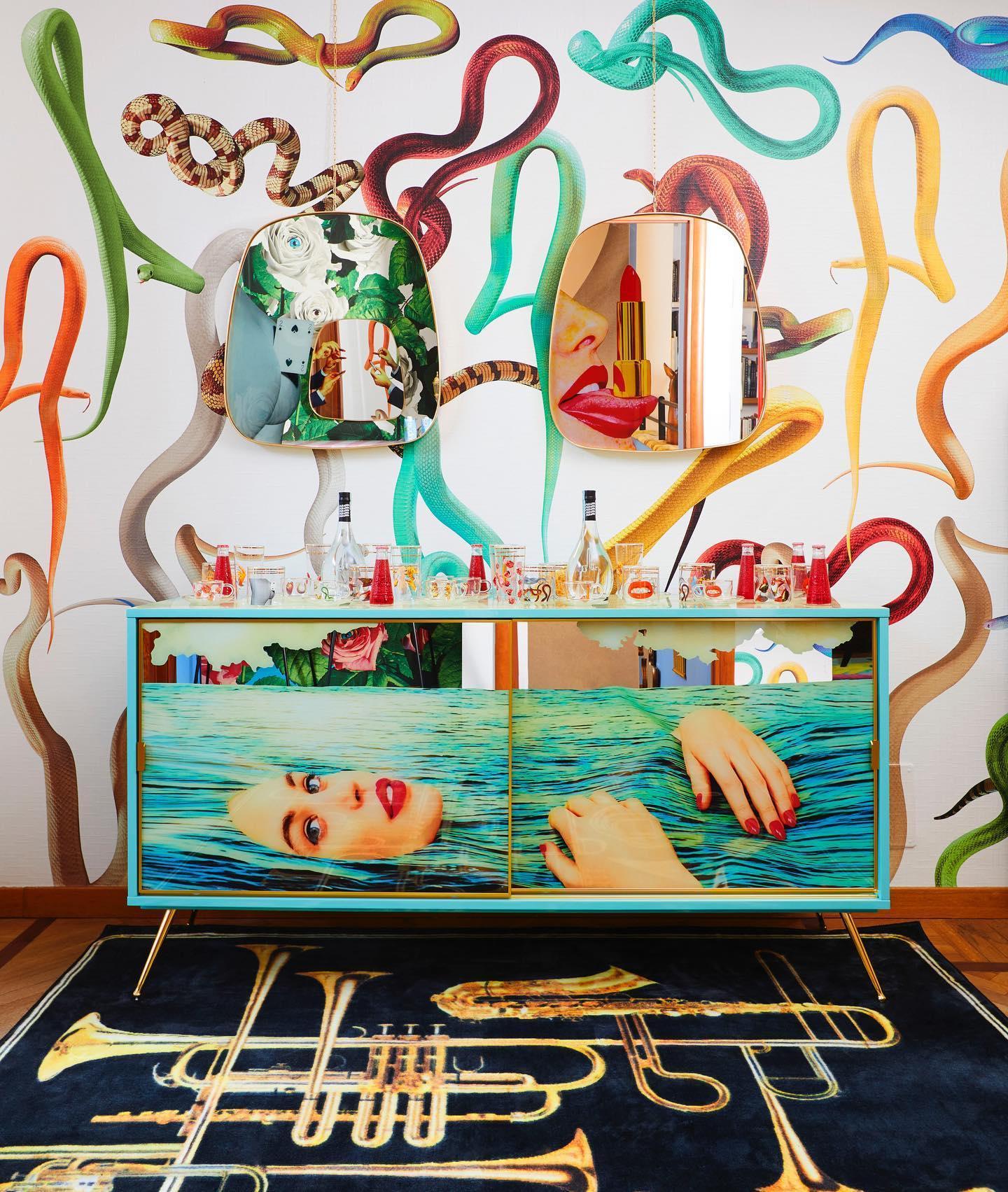 Einzigartiger Spiegel In dem goldenen Rahmen ist es Teil einer einzigartigen Sammlung, die vom italienischen König von Avant -Gärte Seletti und dem Toileletpaper -Magazin erstellt wurde. Interessante, leicht kontroverse Collage, Wie ein Tor zu einer anderen surrealen Dimension verleiht es dem Innenraum einen einzigartigen Charakter.