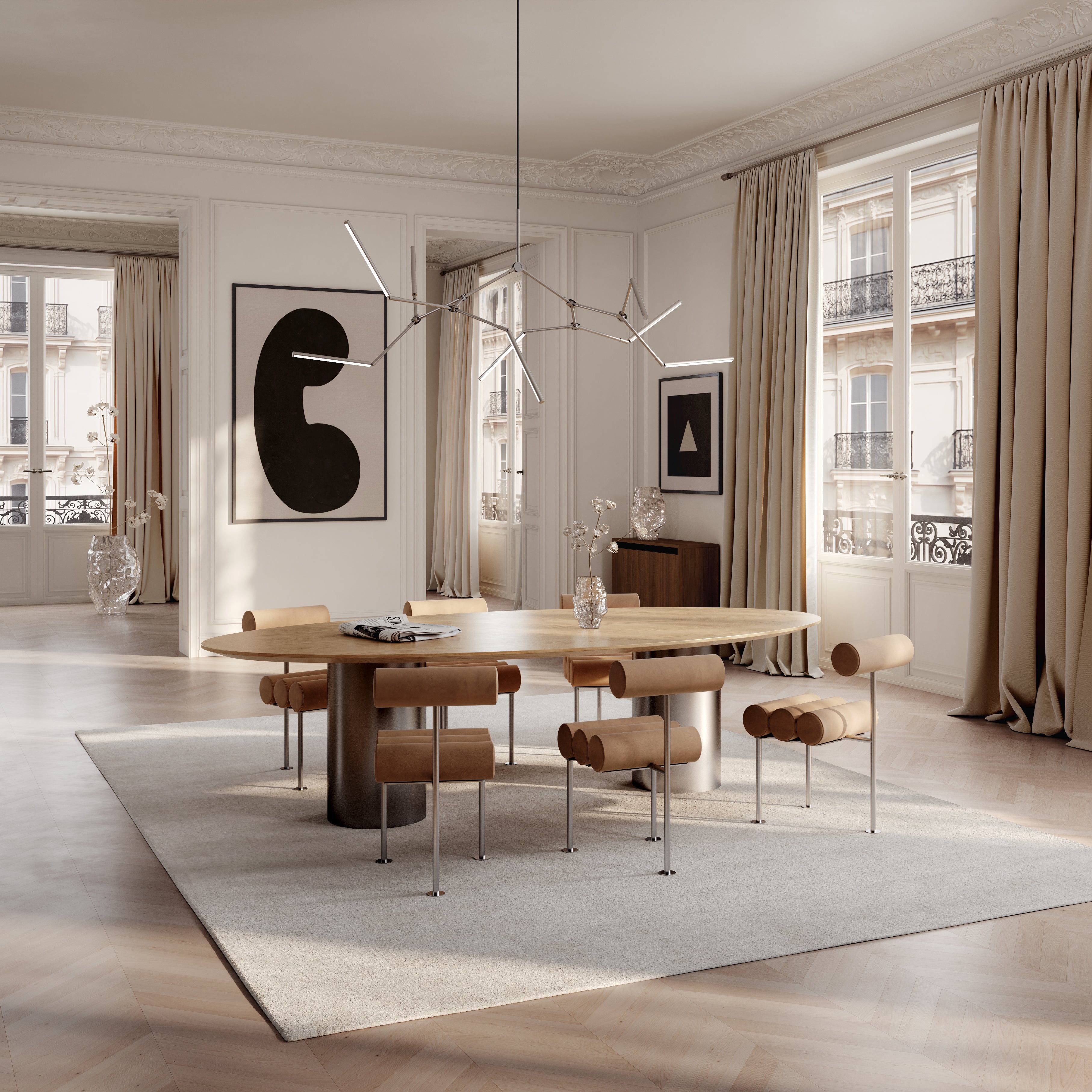 Der Leuchter Stick nimmt Bezug auf die Ästhetik der 80er Jahre, bietet jedoch anstelle kühler Geometrie eine durchdachte, warme Version des Modernismus. Dank der Möglichkeit, acht Arme in verschiedene Richtungen zu positionieren, ermöglicht der Leuchter die Schaffung individueller Kompositionen – von ruhigen, harmonischen Linien bis hin zu expressiven, asymmetrischen Anordnungen. Er eignet sich hervorragend über einem großen Tisch sowie in einem geräumigen Wohnzimmer oder Flur, wo das Licht nicht nur den Raum erhellen, sondern auch die Stimmung gestalten und eine Geschichte über Stil und Form erzählen soll.