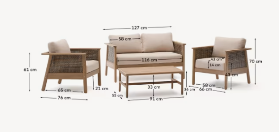 Alabe it A complete garden set, which includes a double sofa, two armchairs and a coffee table. Made of 100%FSC ™ certificate, it combines natural beauty and durability, offering a sophisticated aesthetics for both interior and outside.