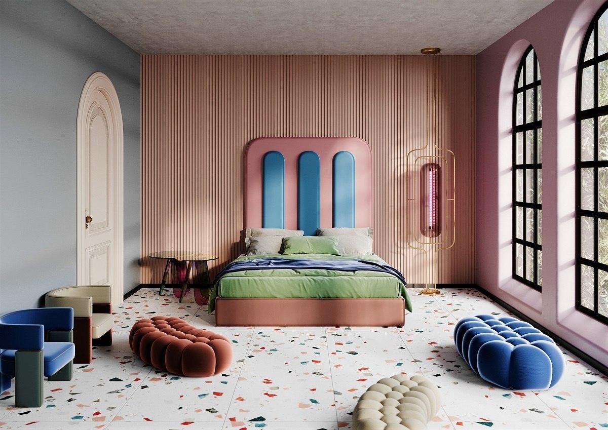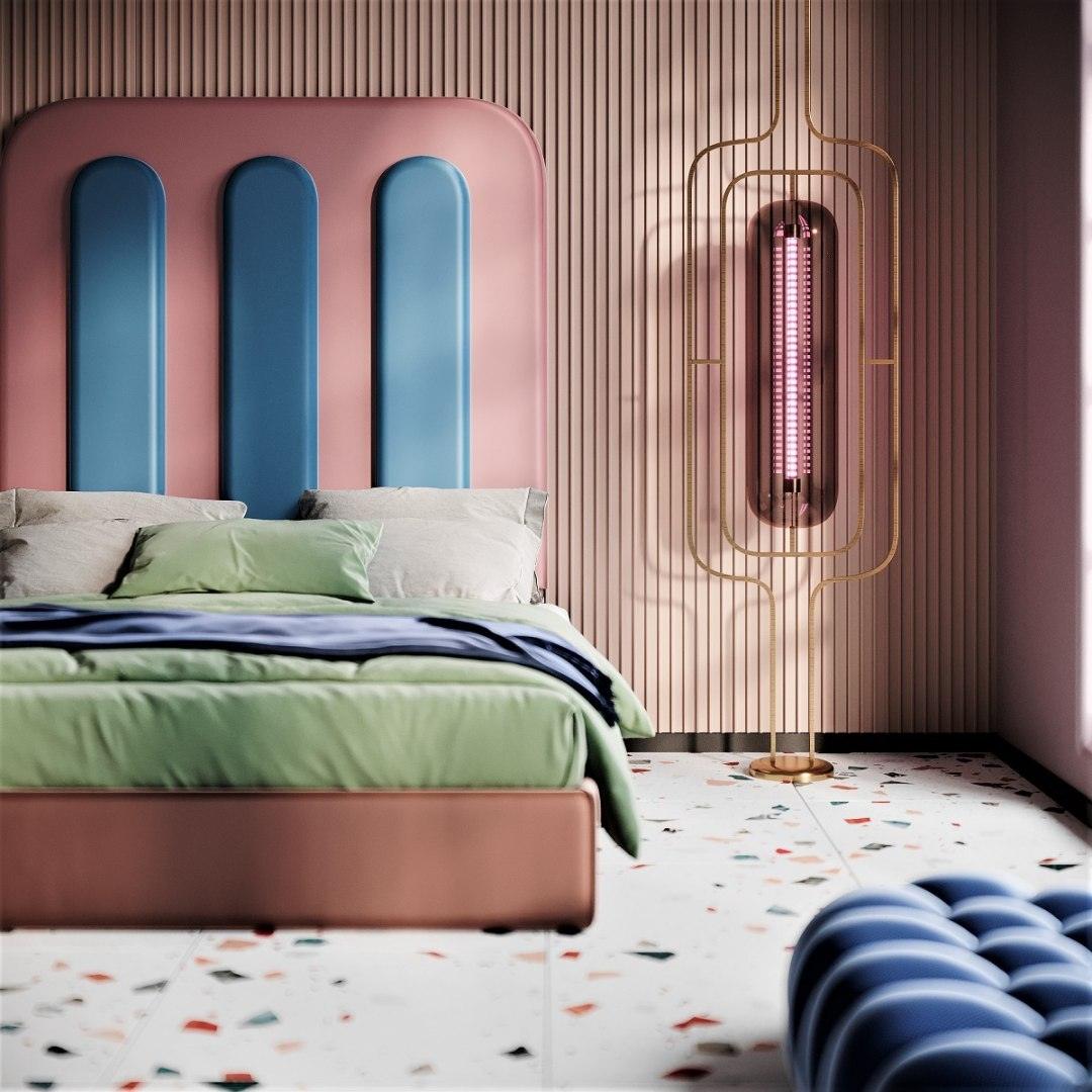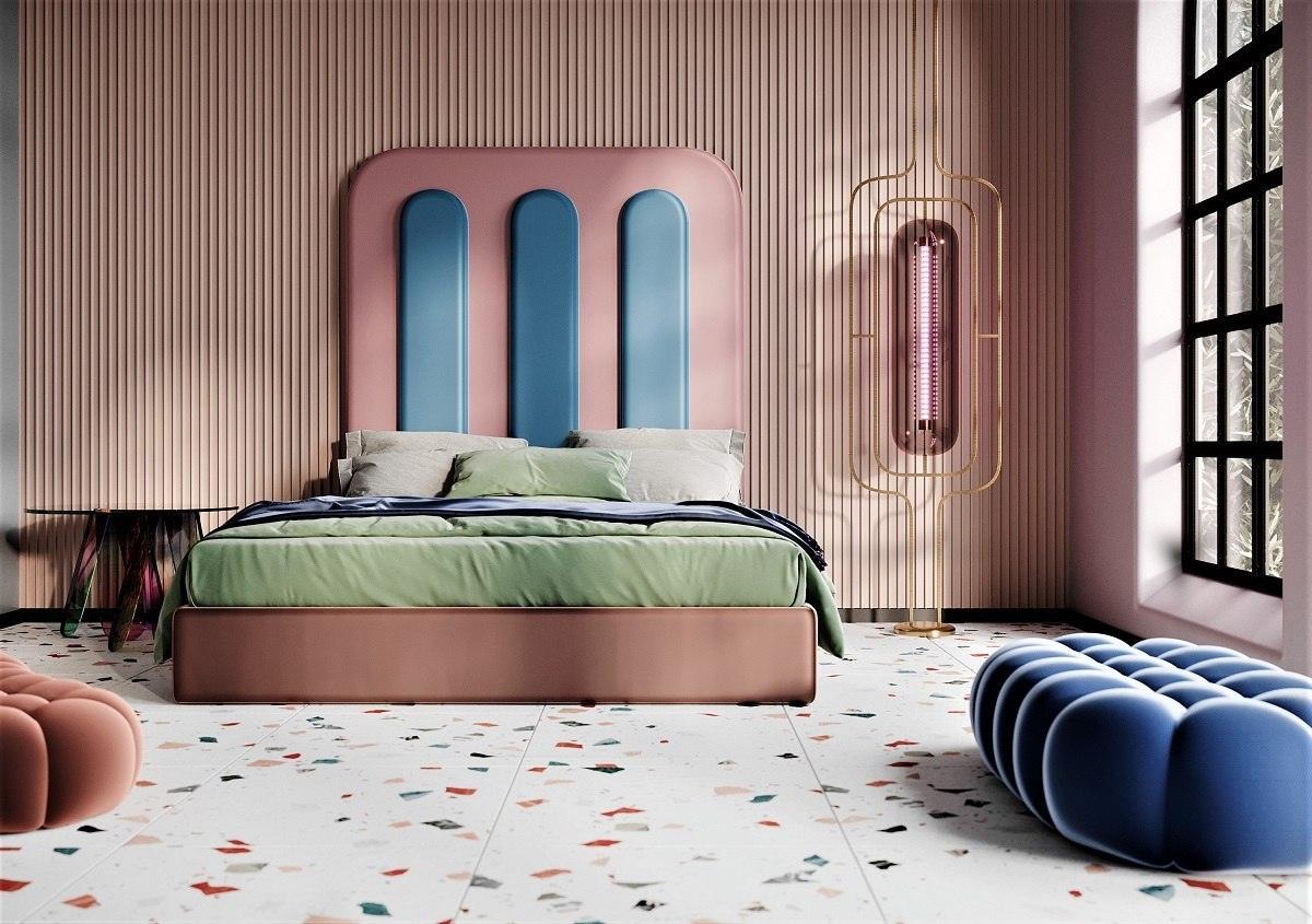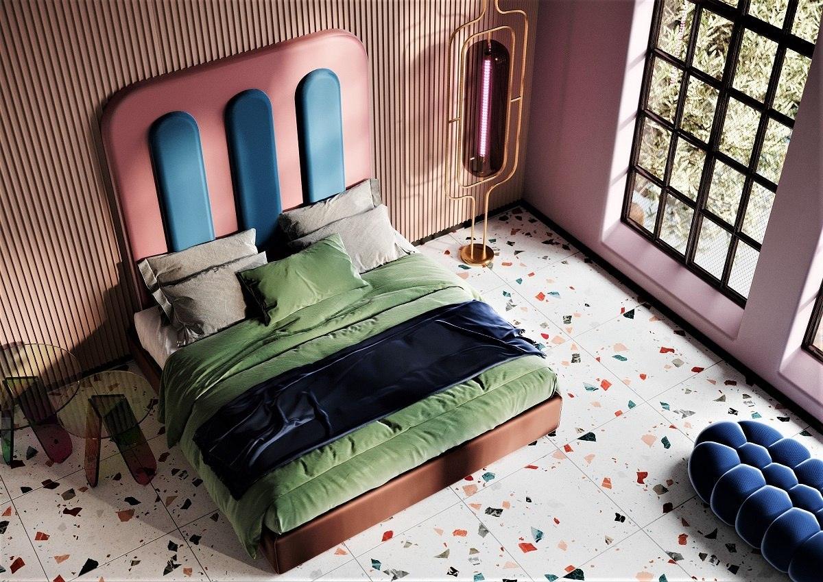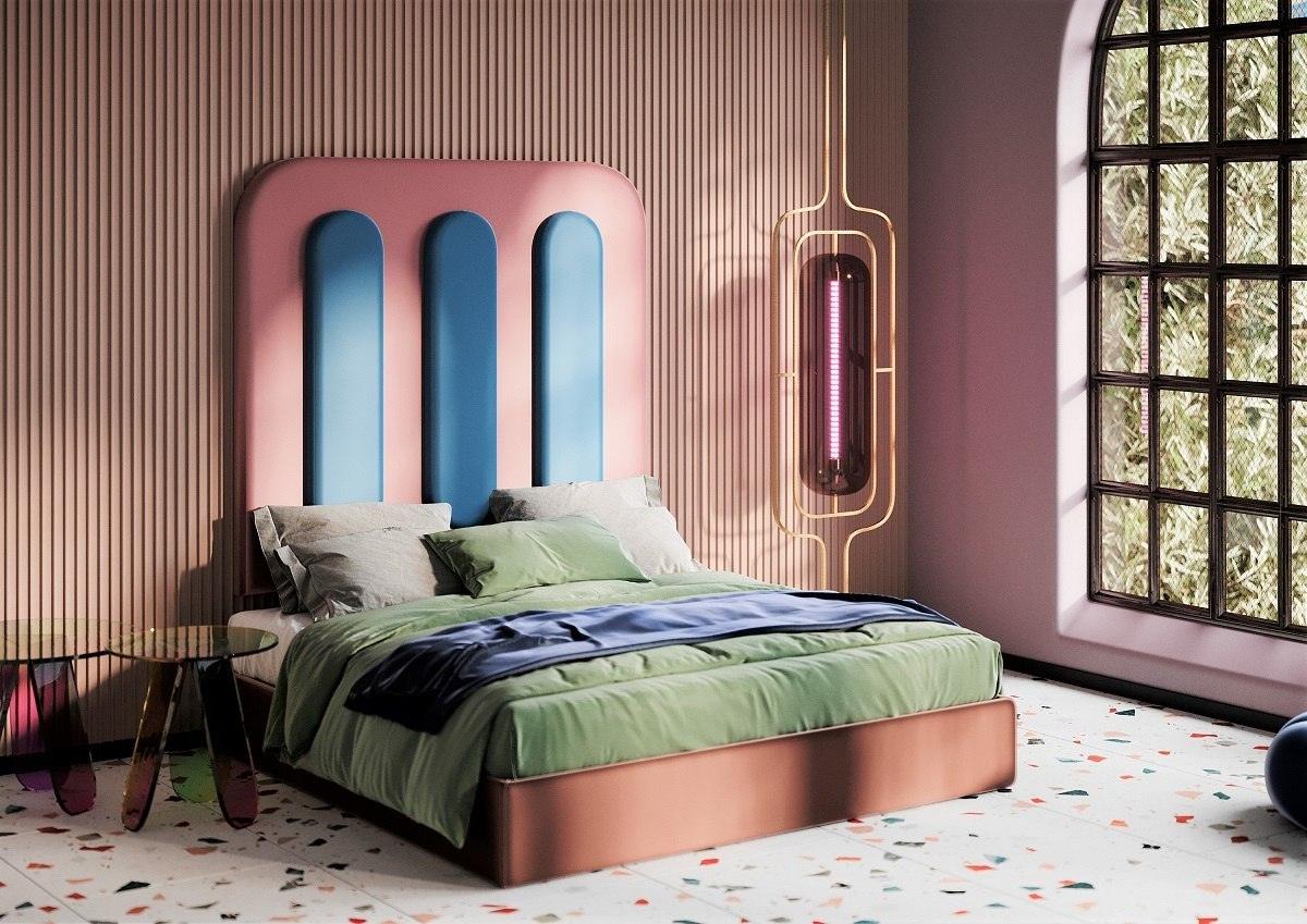 Its original shape resembles an avant -garde cake with filling. In combination with eclectic additions, it will create a unique arrangement of the bedroom in style Memphis.