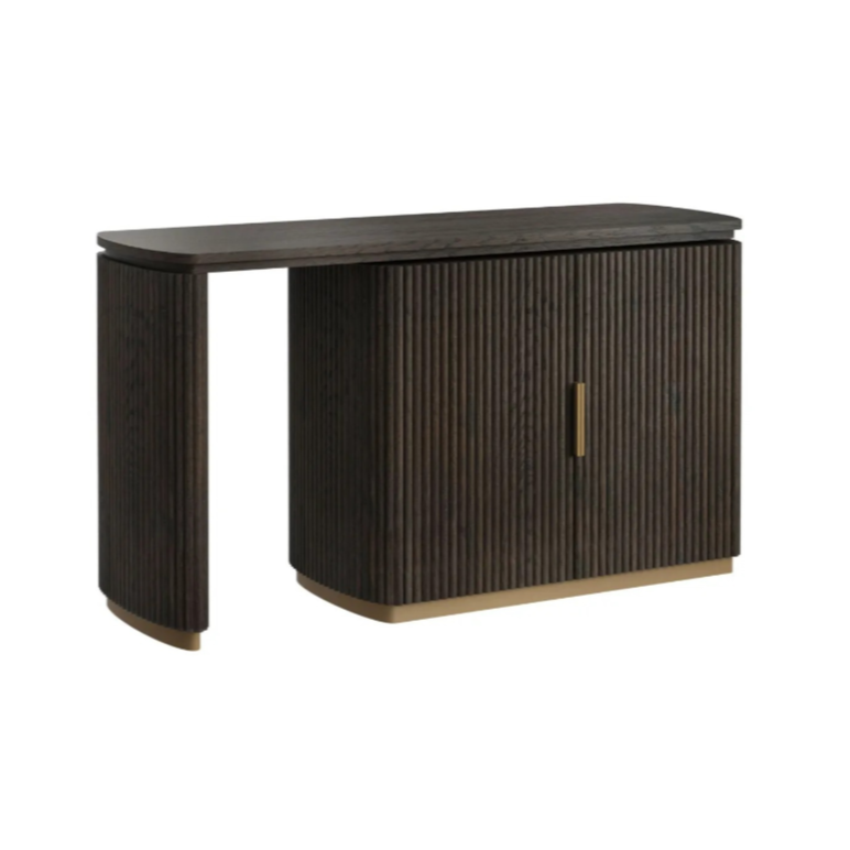 Elegant desk Cambon with a rotating top is a unique combination of modern functionality and luxurious finishing. The fronts with vertical grooves give the furniture character, while the golden accents in the base and handle introduce a subtle touch of glamour style. Rounded shapes and a thick top with a thickness of 3.6 cm create a cohesive, sophisticated whole, perfect for modern and elegant interiors.