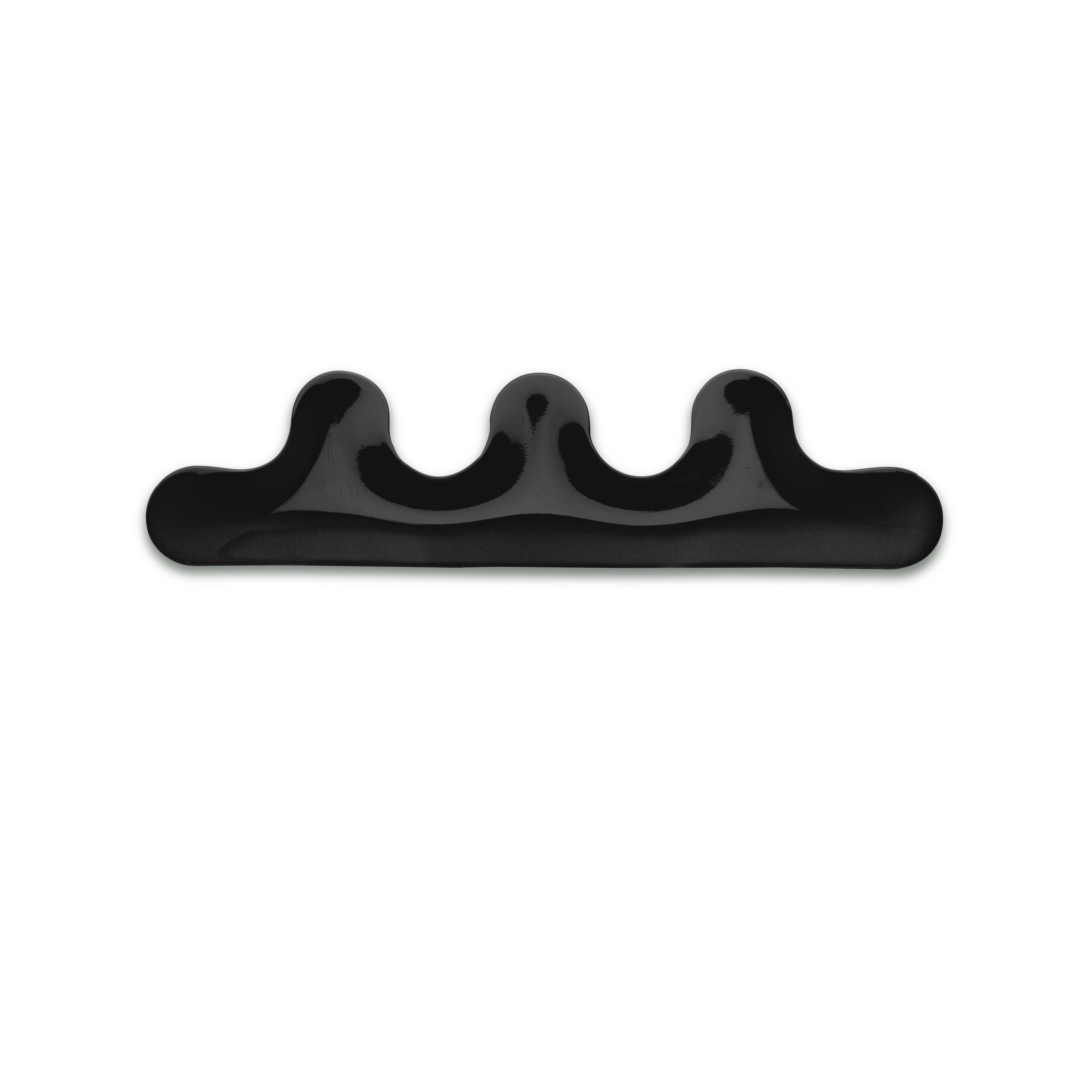 Kamm Coat Rack in glossy black is an extraordinary, undulating story mounted on the wall. This versatile object features unique bulges that add character and give it a distinctive appearance. Kamm not only serves as a practical coat rack but also enriches the space by creating an interesting narrative with the items hung on it.