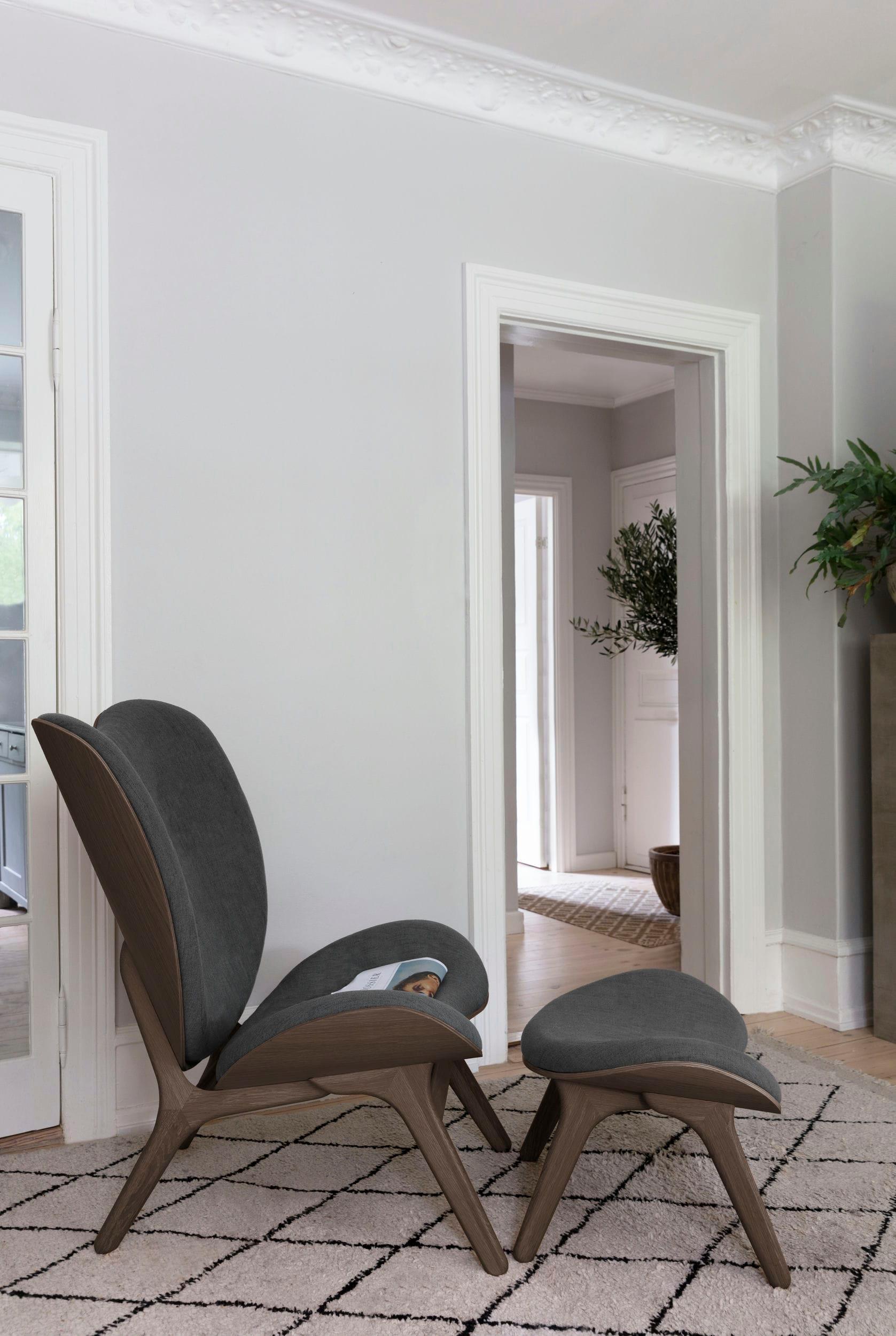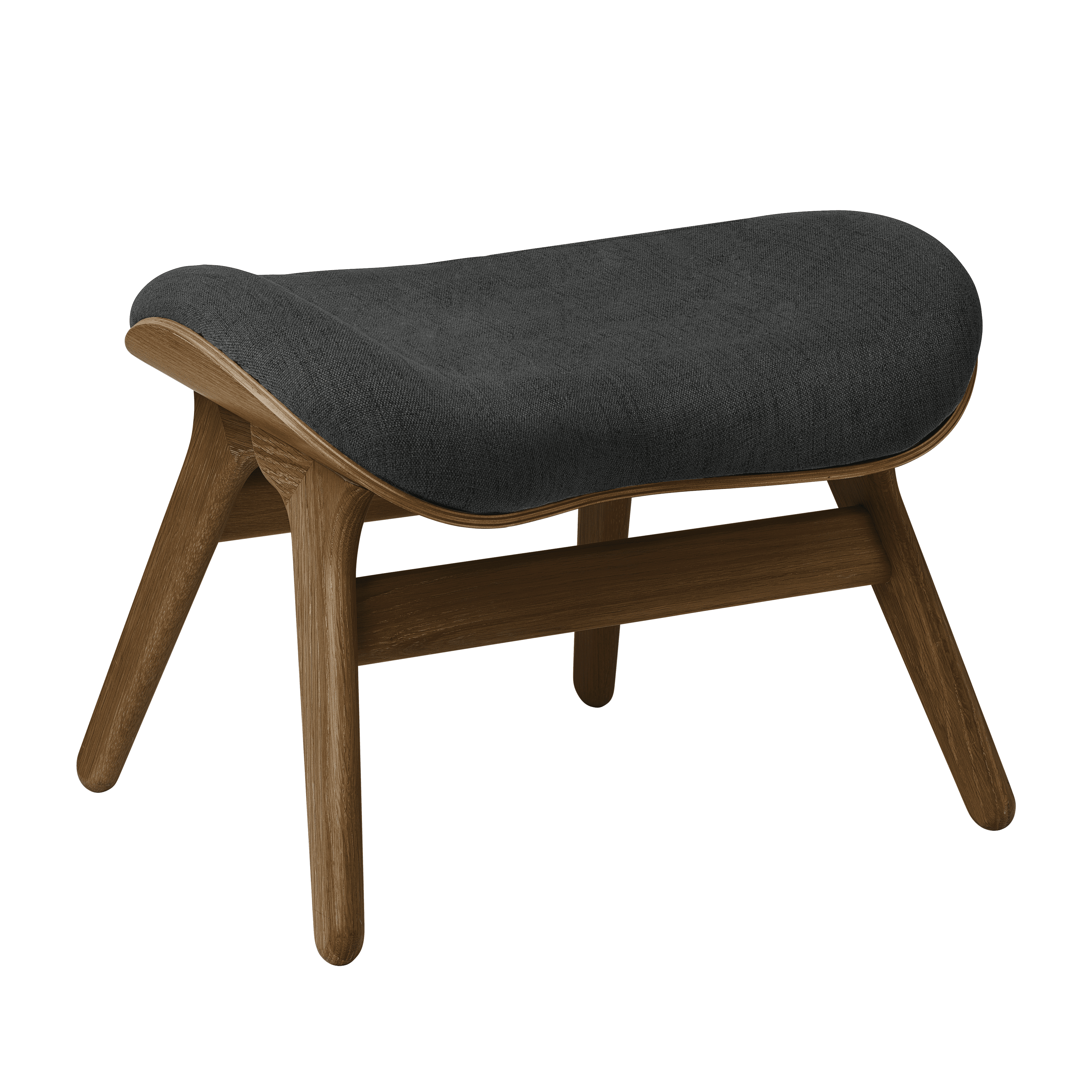 Conversation Piece ottoman is available in three color variants: oak, dark oak, and black oak, each offered in eight carefully selected shades of Horizons fabric, made from 100% recycled materials or two fabrics from the Teddy collection.