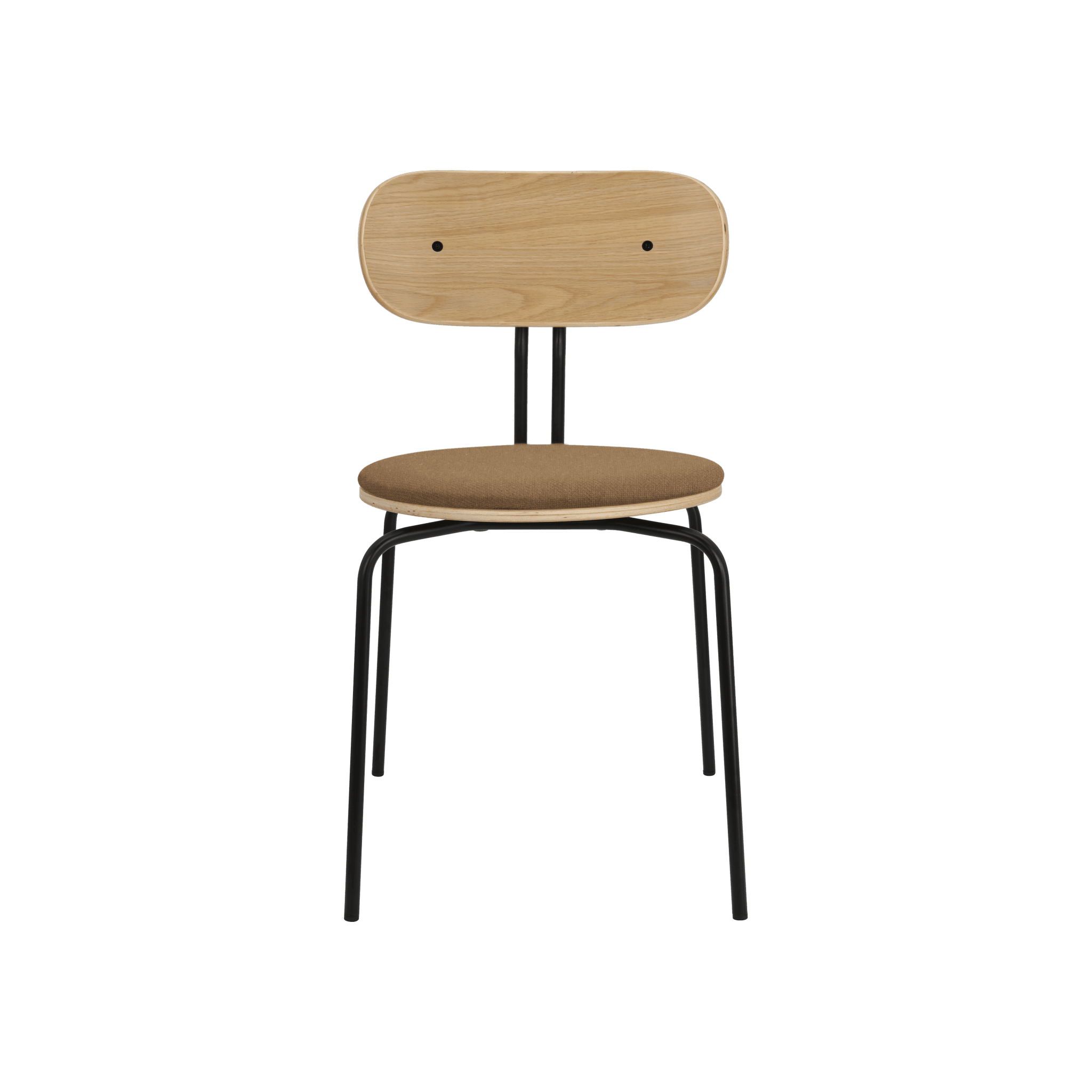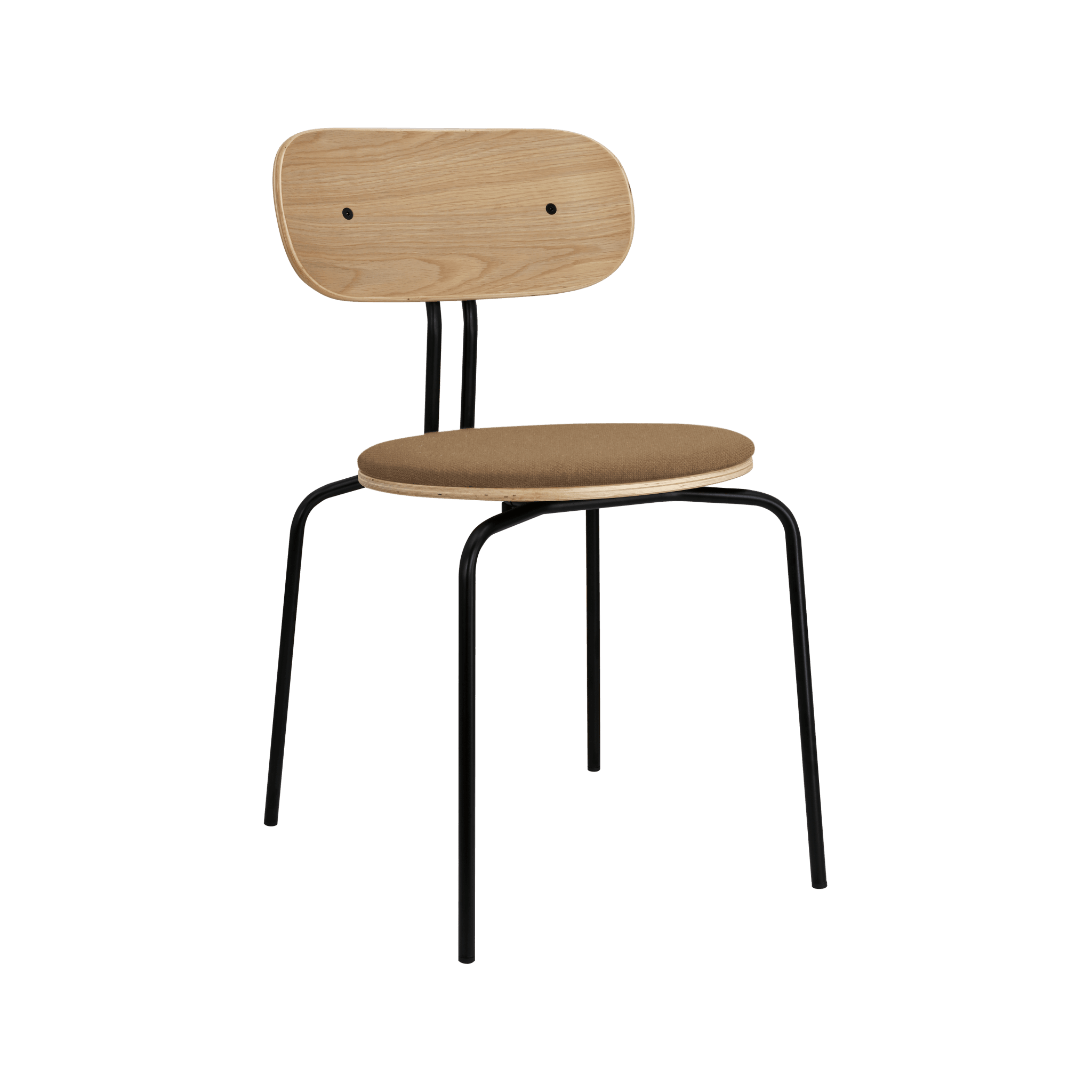 Chair Curious is elegant, light and minimalist furniture, made of oak veneer. It is available with brass or black legs, and the optional seat cushion provides additional comfort. You can choose a pillow from 17 colors of Horizons fabric, made 100% recycled, as well as in a brown or white shade of Teddy Bear fabric.