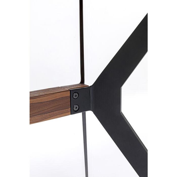 Dining table with a designer flair. The surface of the tabletop made of solid wood features a distinctive, natural grain pattern. The lacquer provides an elegant surface with a protective layer. The dynamically shaped base made of black steel gives this dining table a sense of dynamism and lightness. As a stylish addition, the wooden central support of the frame harmonizes with the tabletop.
