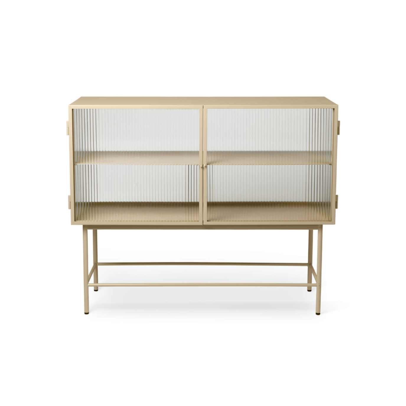 Dresser Haze is distinguished by an elegant metal frame in a subtle color of cashmere, which perfectly fits into a variety of interiors. Walls and doors made of grooved glass give it style, while discreetly covering the stored objects. Ideally suited as a practical storage solution in the corridor, home office, bathroom or dining room, adding elegance and style to the interior.