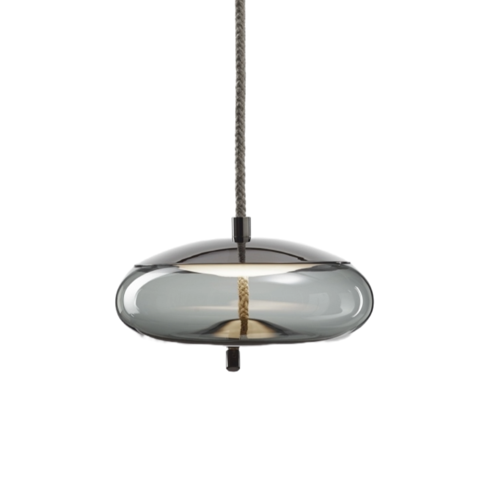 Hanging lamp Knot Small combines elegance, inflatable glass with the rawness of thick rope, creating a sophisticated design. The central element is the rope, which drags the lower part of the glass, creating a plastic effect. LED light source, hidden under a metal hood and protected by a tanning diffuser, adds a subtle glow lamp.