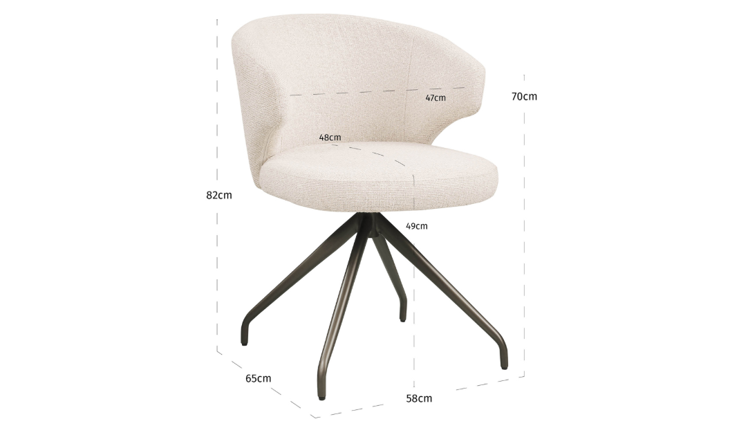 Krzesło obrotowe Milly charakteryzuje się miękkim i przyjaznym wyglądem, który wprowadza do wnętrza ciepło i komfort. Jasnobrązowy kolor nadaje przestrzeni przytulny, ciepły akcent, a funkcja obrotu zapewnia łatwość użytkowania, umożliwiając swobodne manewrowanie. Elegancka sylwetka krzesła łączy wygodę z wyrafinowanym designem, co sprawia, że jest to doskonały wybór zarówno do przestrzeni mieszkalnych, jak i do bardziej formalnych projektów, w których elastyczność jest kluczowa.
