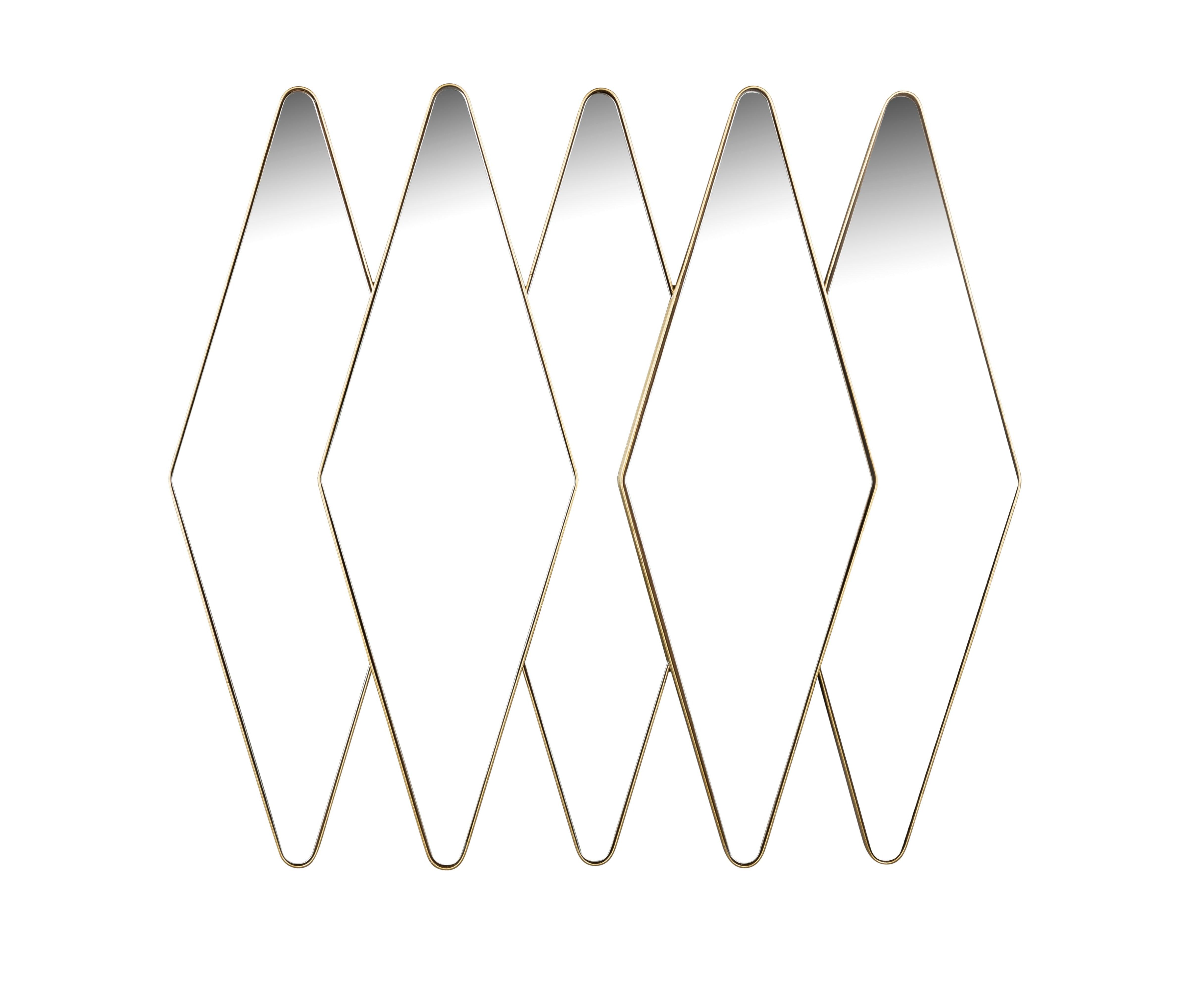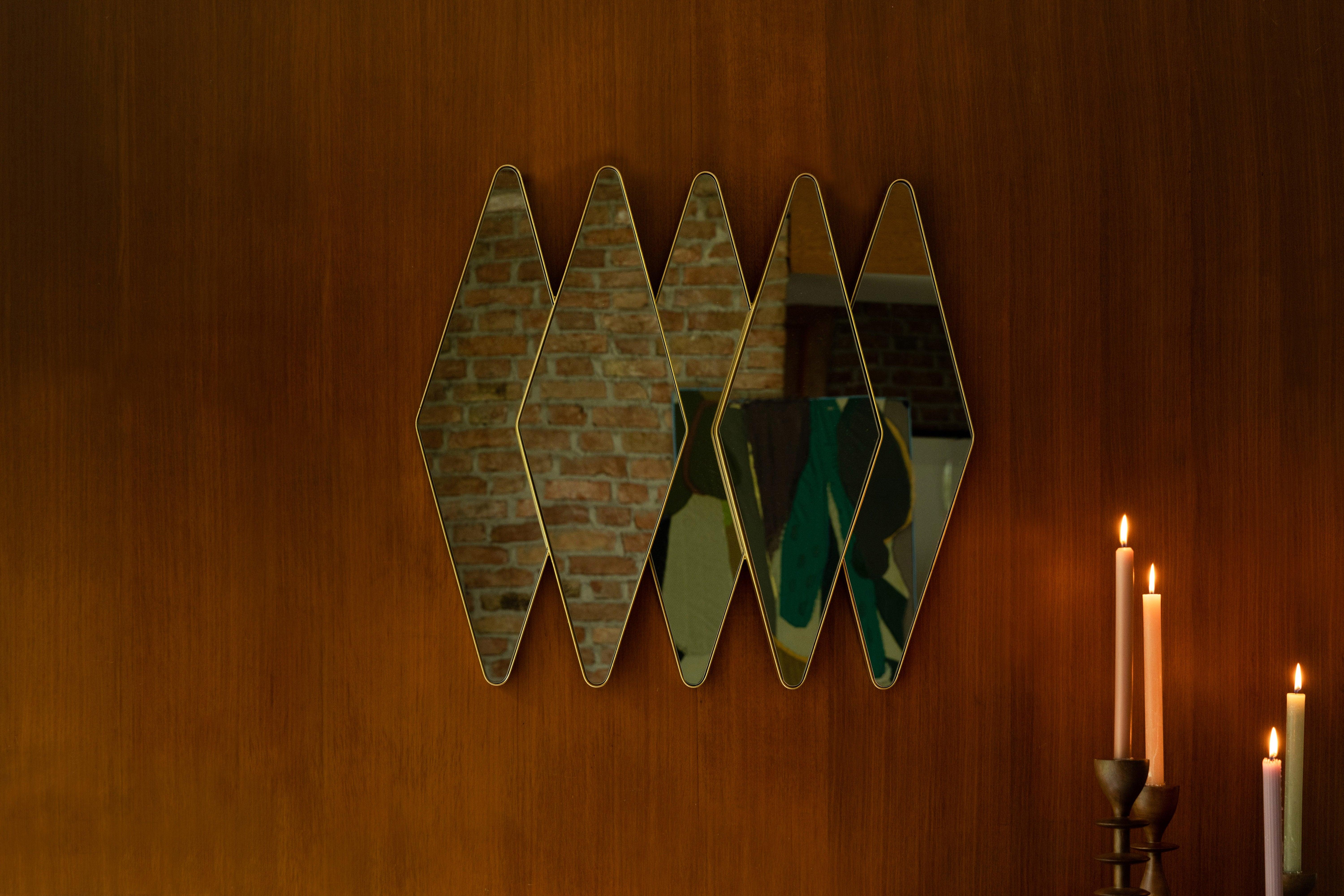 The wall mirror Kyoko is made of glass and metal. It consists of five diamond-shaped mirrors with rounded corners and a brass edge. The inspiration from 70s design gives it a unique style that brings a warm, nostalgic atmosphere to the interior.
