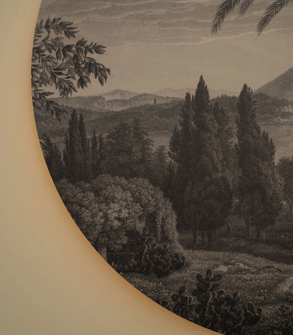 Wall lamp Dots Lighting Tropical Volcano Vista is exotic lighting inspired by the power of nature and picturesque tropical landscapes. The illustration depicting a majestic volcano surrounded by lush vegetation and a sky in shades of blue creates a composition full of mystery, harmony, and visual depth. The subtle light highlights the details of the drawing, giving the whole a moody, relaxing character.