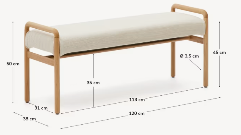 The upholstered seat in chenille fabric introduces texture and coziness, while the removable cover secured with a drawstring makes it easy to keep the furniture clean. The filling made of 30 kg/m³ density foam ensures comfort during use. The Macaret bench is crafted from FSC Mix Credit certified wood, making it a responsible choice for interiors where quality and sustainable materials matter.