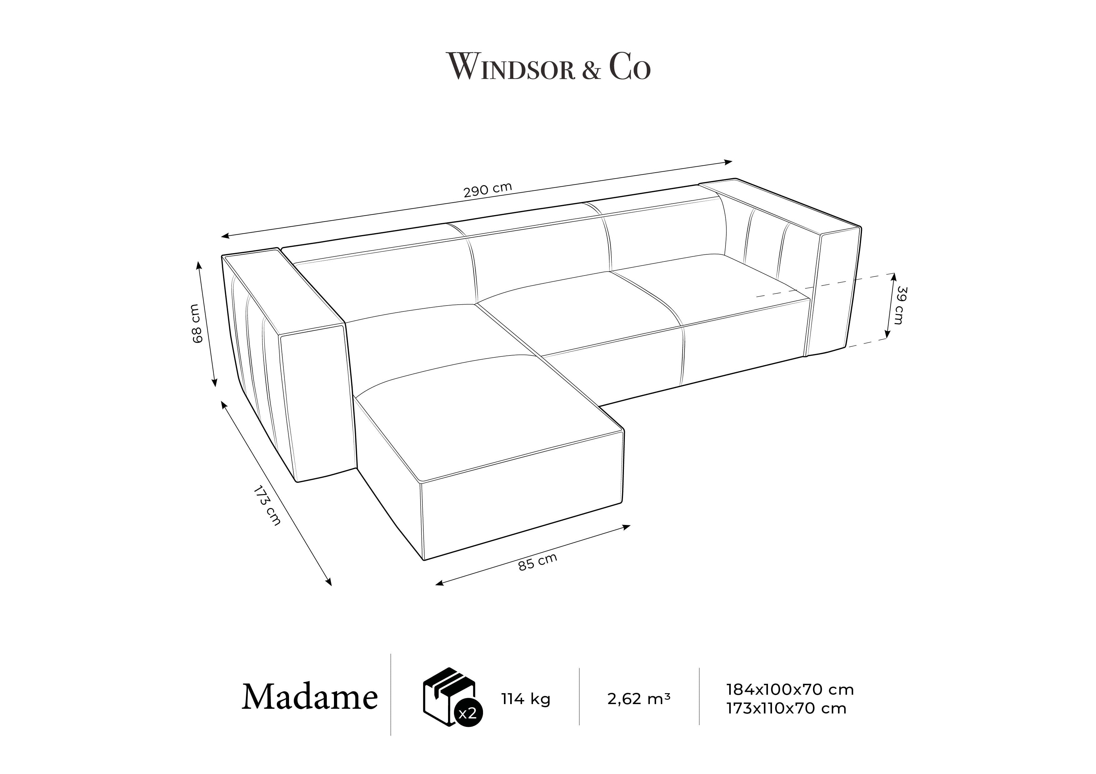 Corner sofa for four people Madame, with its distinctive character and elegant finish, is the perfect choice for a modern living room. The deep seat is ideal for social gatherings as well as for moments of relaxation after a long day. It allows you to comfortably rest in casual positions. With its low profile, wide armrests, and backrests, it creates a cozy shape.